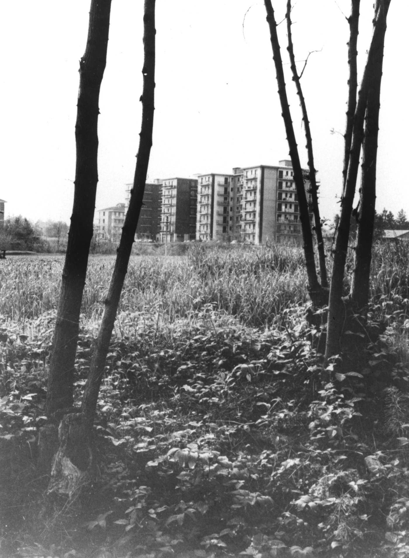 I condomini di Via Cadorna n. 22-24, visti attraverso i campi circostanti.