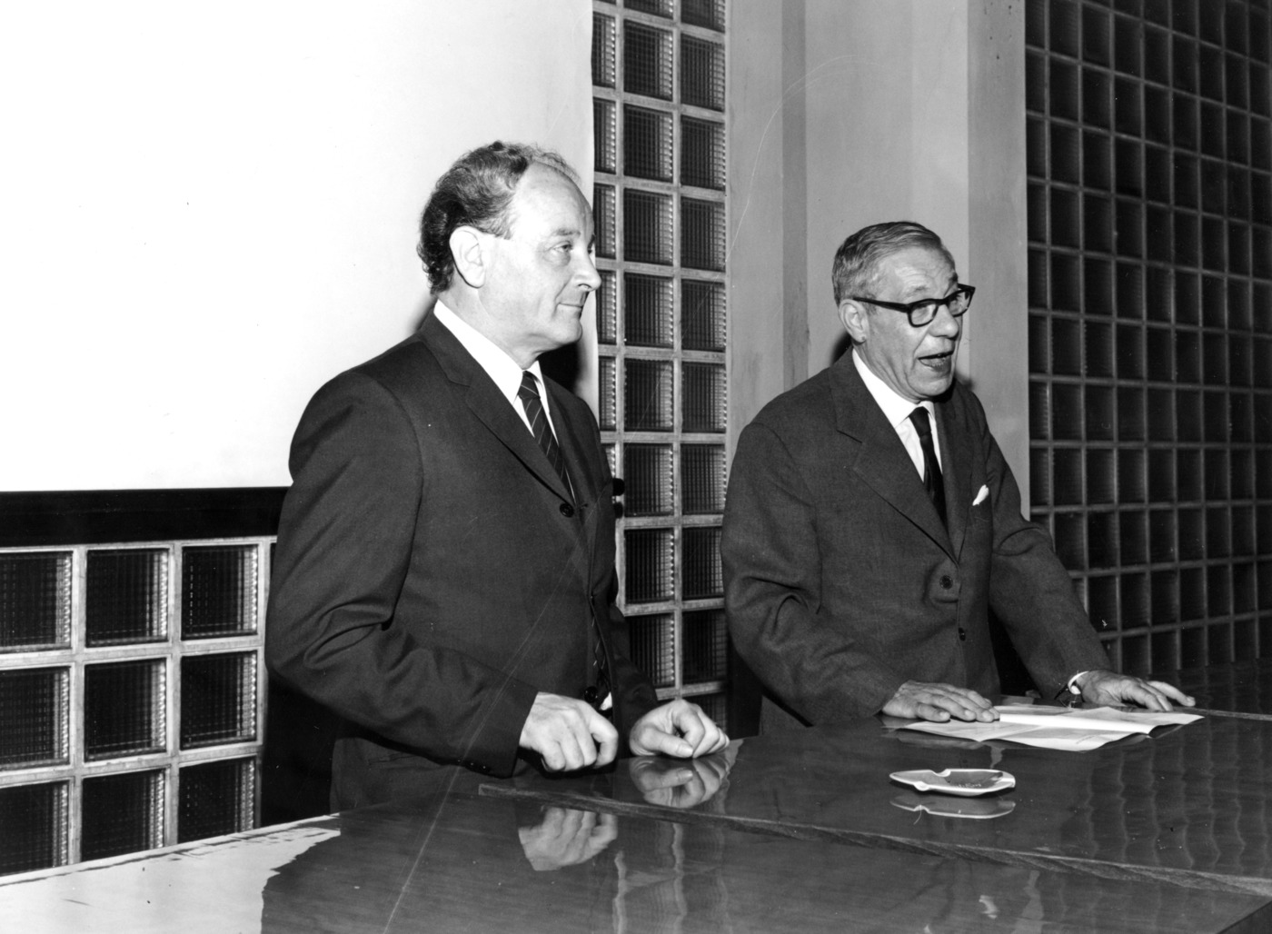 Conferenza sul rinvenimento di reperti archeologici nel territorio di Vimercate, tenuta da Augusto Merati (a sinistra) il 9 novembre 1967.
