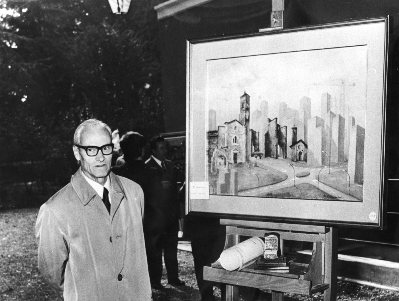 I concorso di pittura Citta` di Vimercate, organizzato dalla Biblioteca Civica: il primo classificato, Lelio Luciani, fotografato accanto alla sua opera.