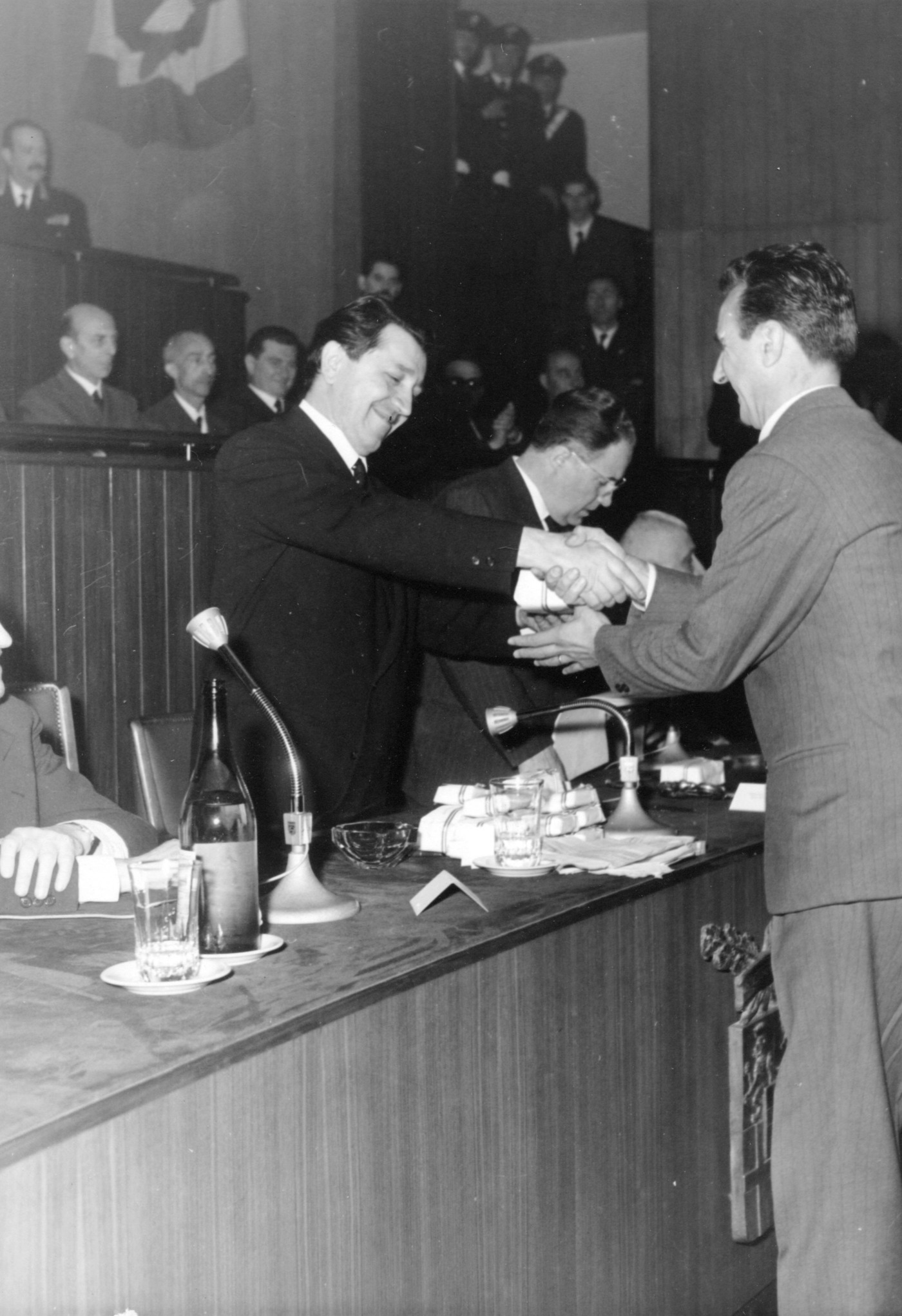 La consegna di un premio al sindaco di Vimercate Ezio Riva da parte del presidente dell'Amministrazione provinciale