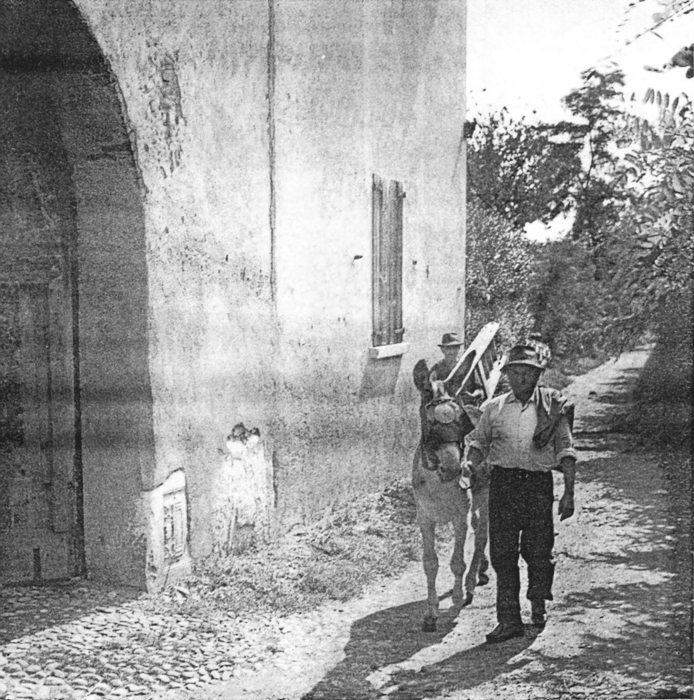 Ernesto e Mario Brioschi tornano dai campi con l'asino verso la Cascina San Pietro. Da notare, murato alla base del portale