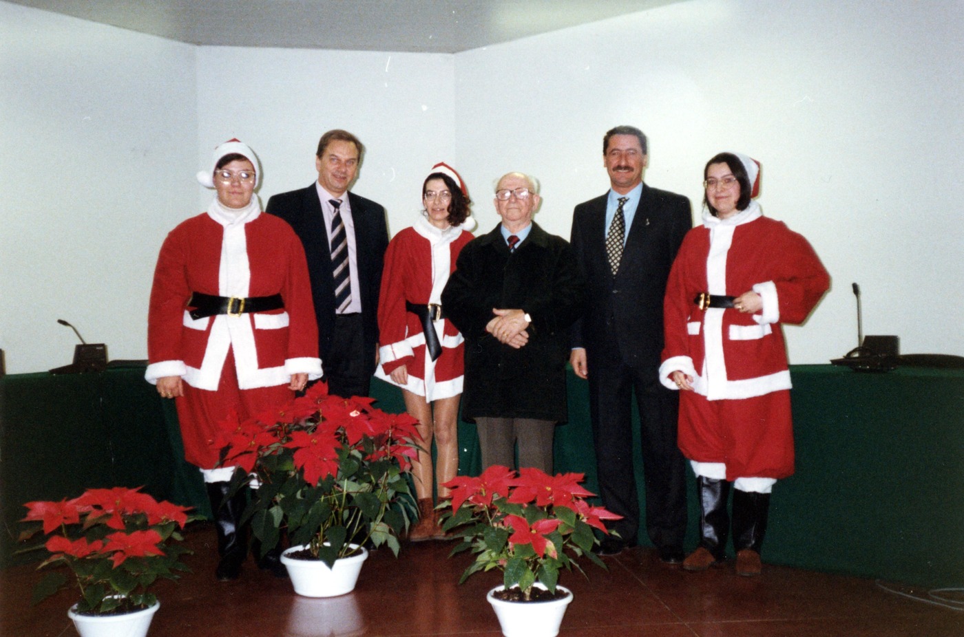 l'auditorium della Biblioteca civica nel dicembre del 1993. Il sindaco Andrea Flumiani (primo da sinistra) posa con