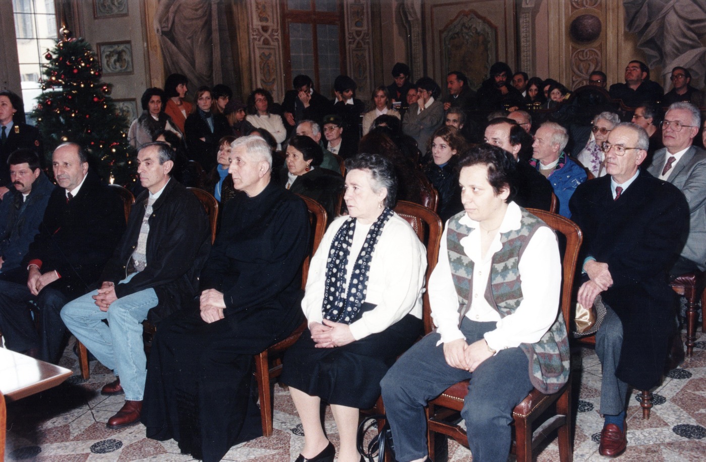 I partecipanti alla cerimonia di premiazione di alcuni cittadini vimercatesi benemeriti, svoltasi nella Sala Cleopatra di Palazzo Trotti il 23 dicembre 1997.