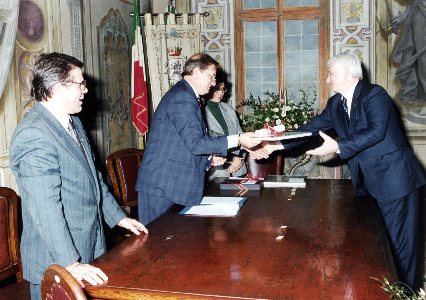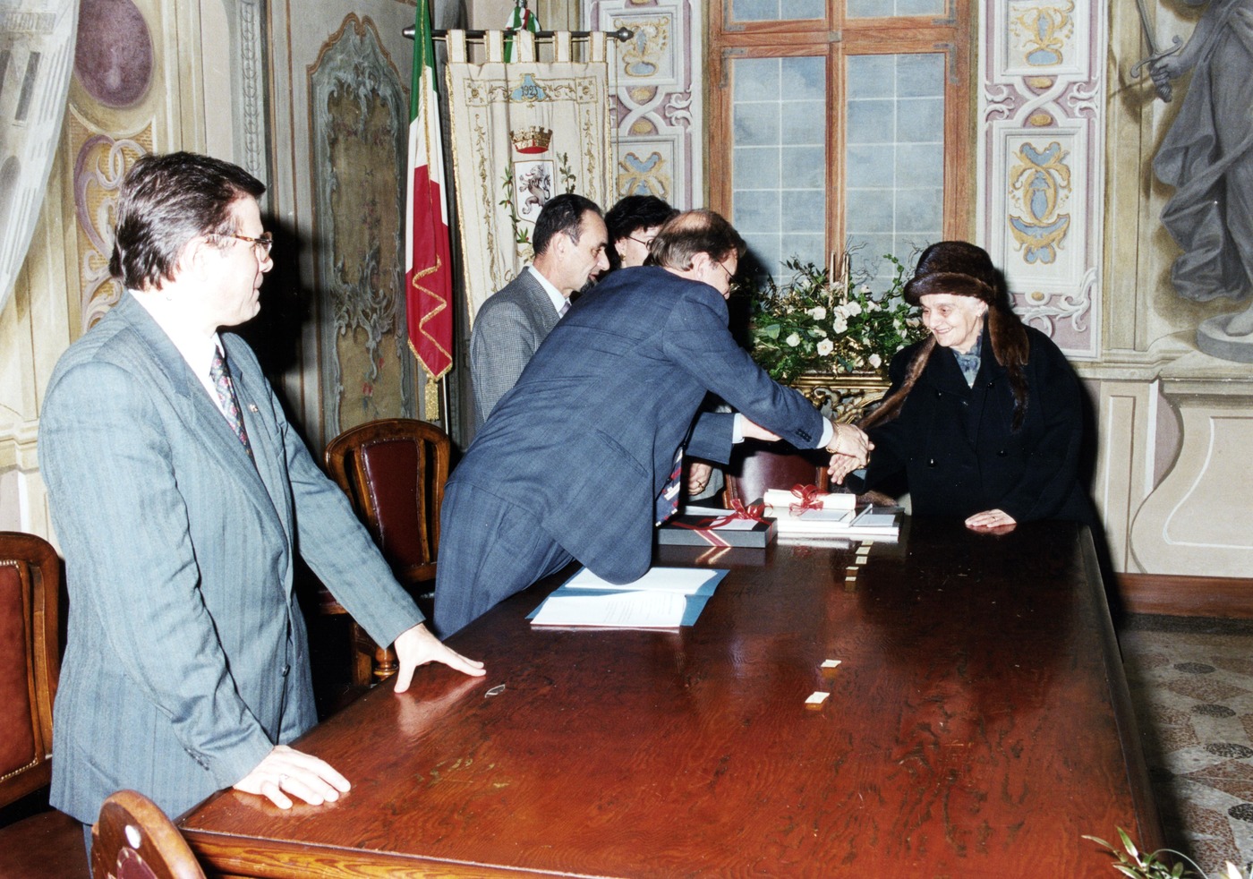 alcuni cittadini vimercatesi benemeriti, svoltasi nella Sala Cleopatra di Palazzo Trotti il 24 dicembre 1996. In alto, la