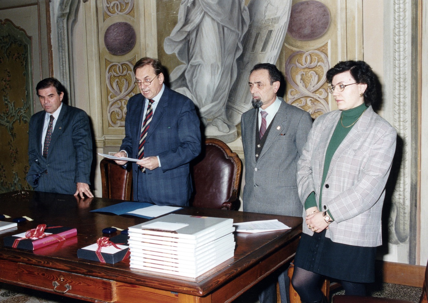benemeriti, svoltasi nella Sala Cleopatra di Palazzo Trotti il 24 dicembre 1996. Da destra: la dipendente comunale Susy