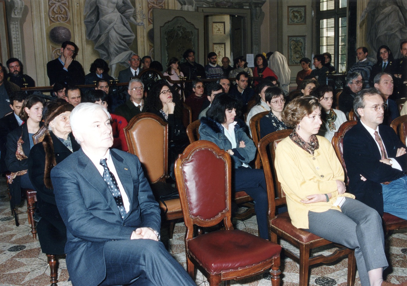 I partecipanti alla cerimonia di premiazione di alcuni cittadini vimercatesi benemeriti, svoltasi nella Sala Cleopatra di Palazzo Trotti il 24 dicembre 1996.