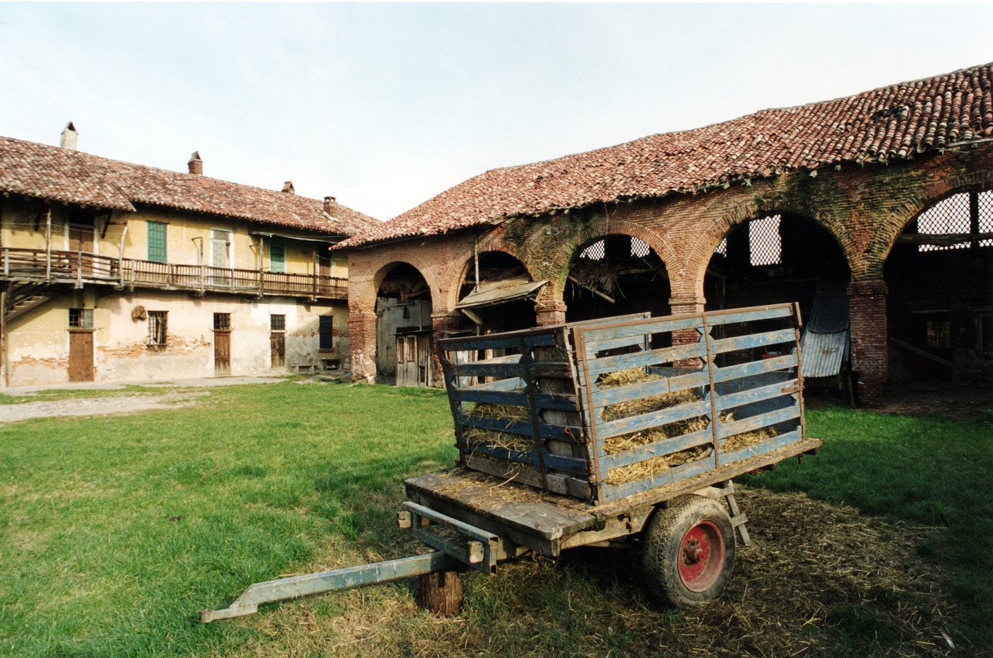 Un carro di fieno nel cortile della Cascina Cavallera.