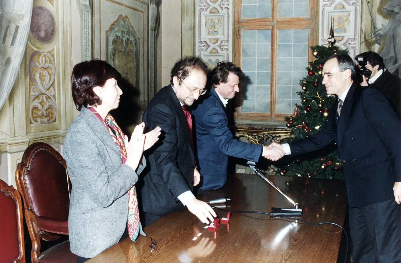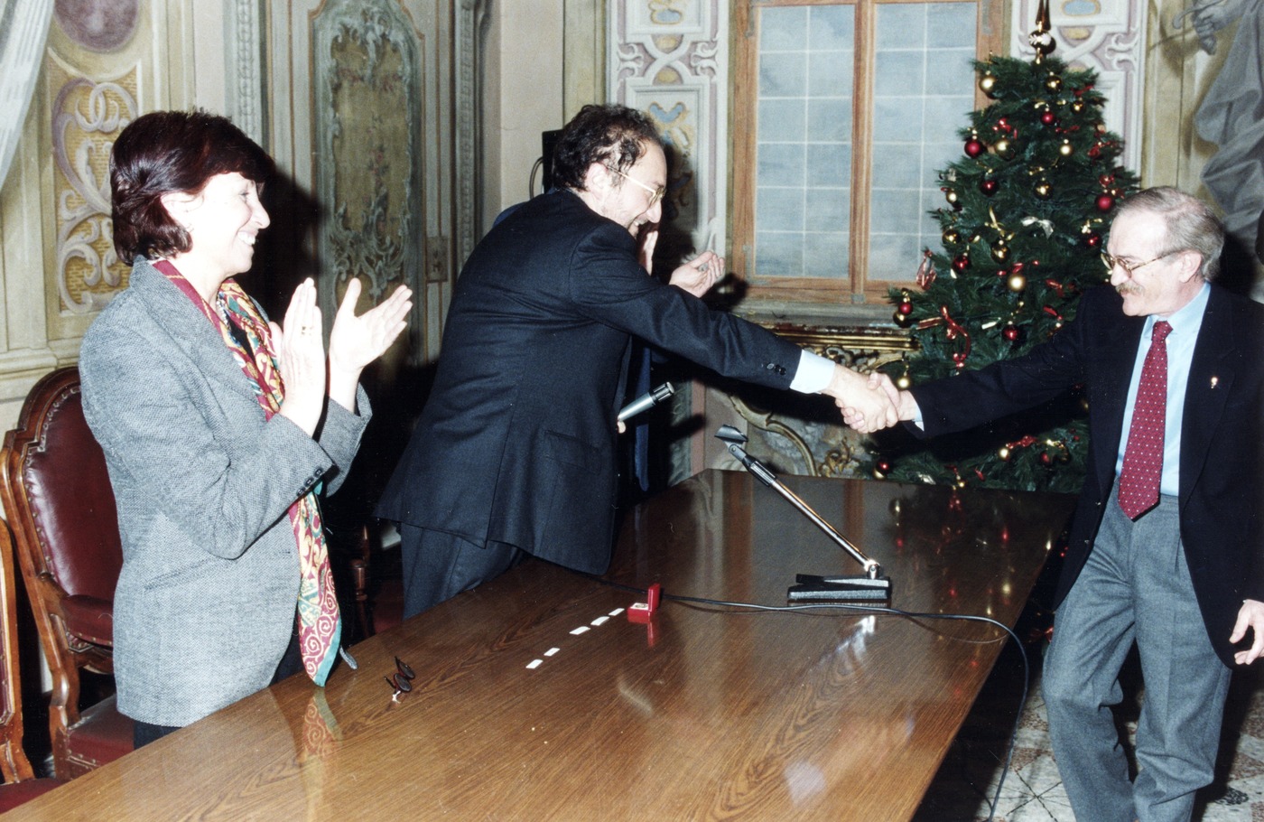 Trotti il 23 dicembre 1998, il sindaco Enrico Brambilla consegna dei riconoscimenti al cantautore Aurelio Barzaghi (in alto) e