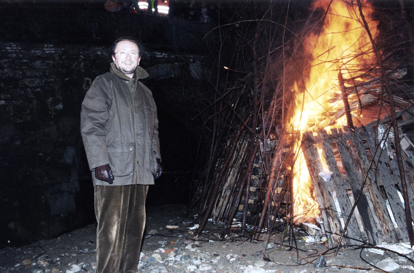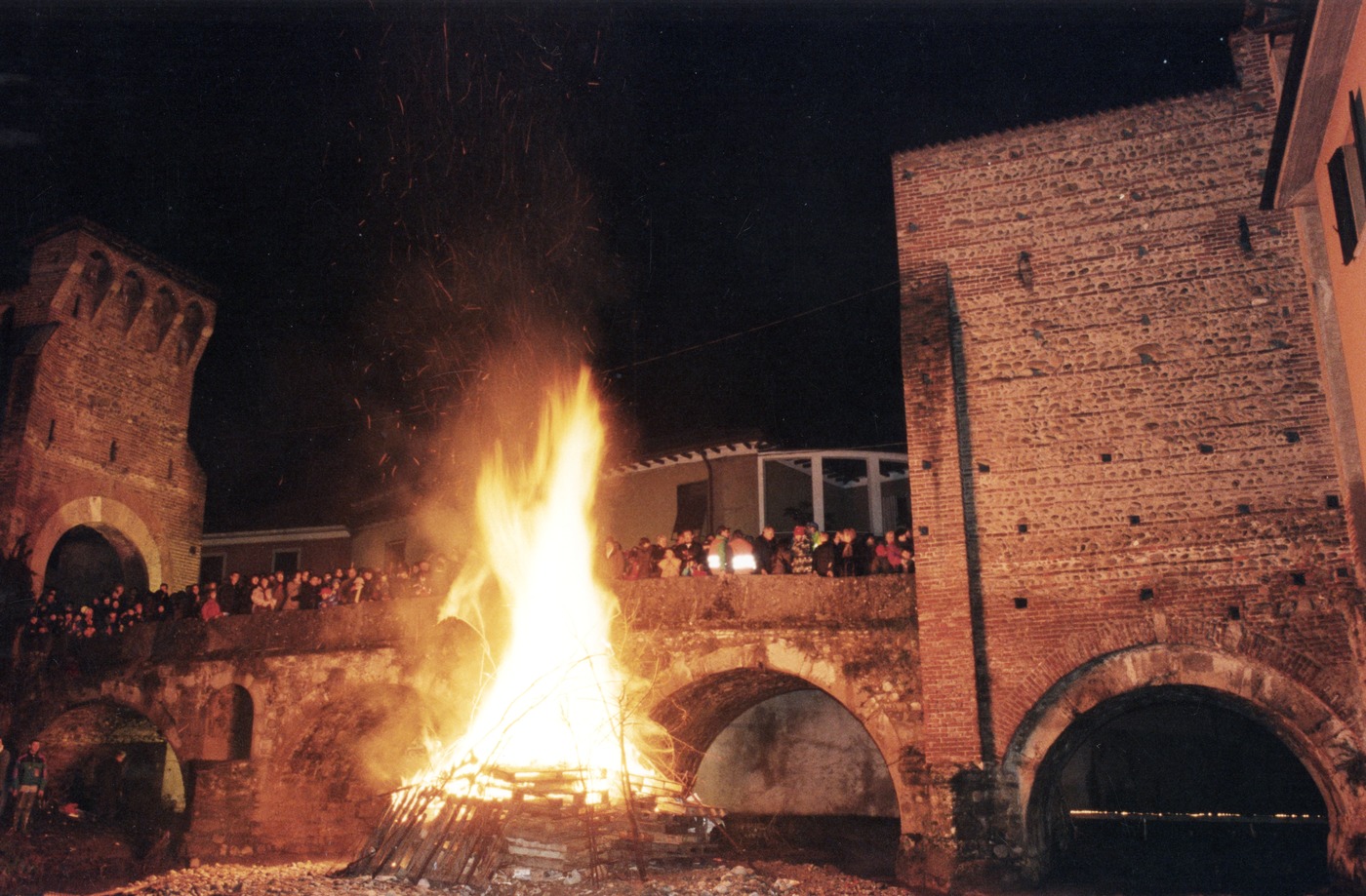Il falo` della Sagra di Sant'Antonio del 1998, presso il Ponte di San Rocco. Sotto, il sindaco Enrico Brambilla sul greto del