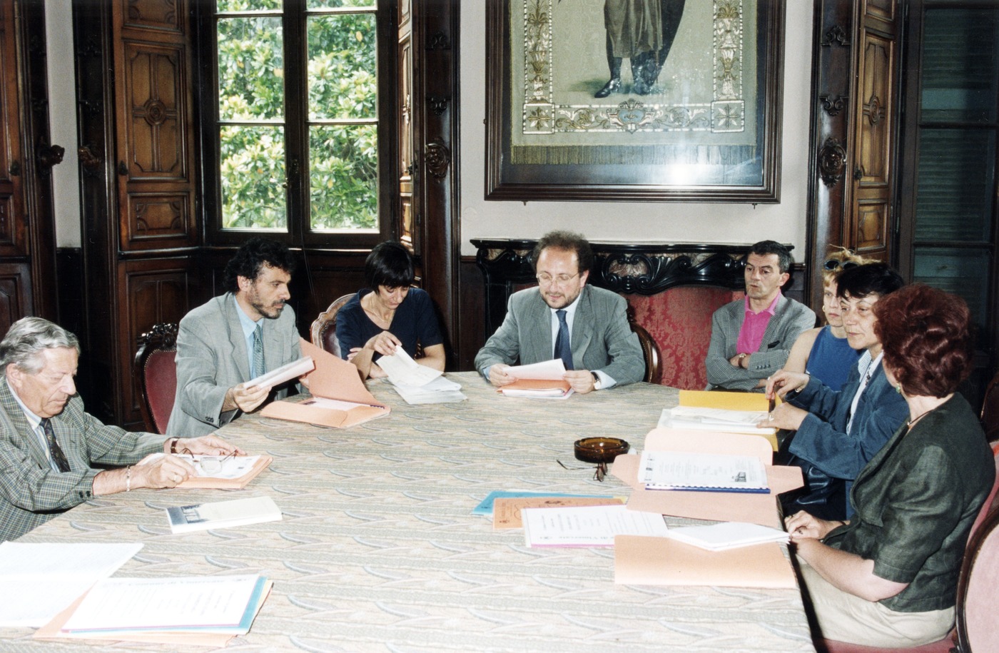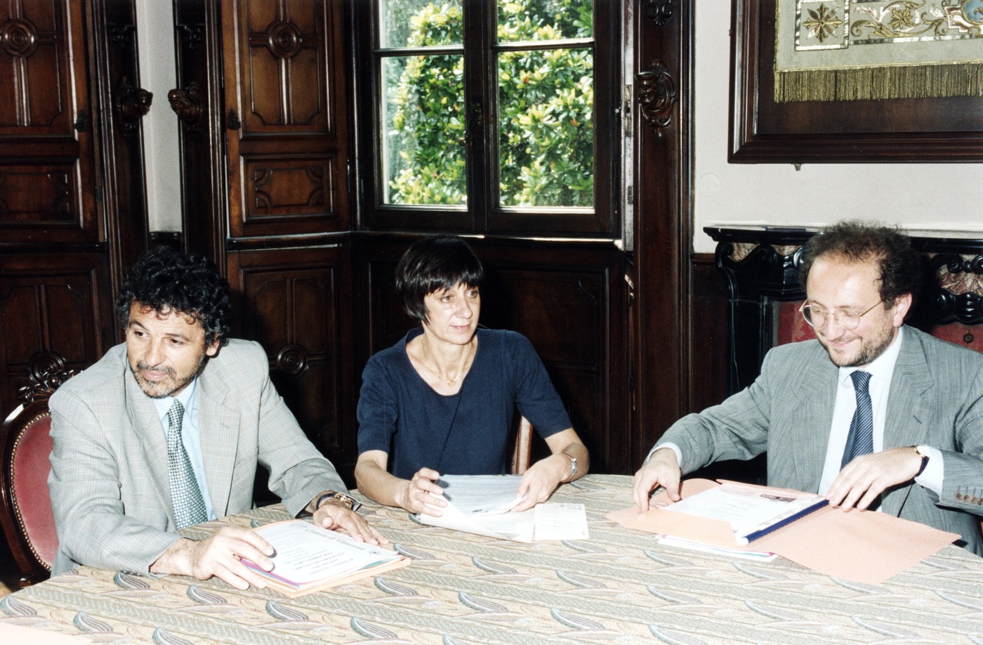 Trotti il 10 giugno 1998. In basso, il sindaco di Vimercate Enrico Brambilla (a destra), l'assessore alla Cultura della Provincia