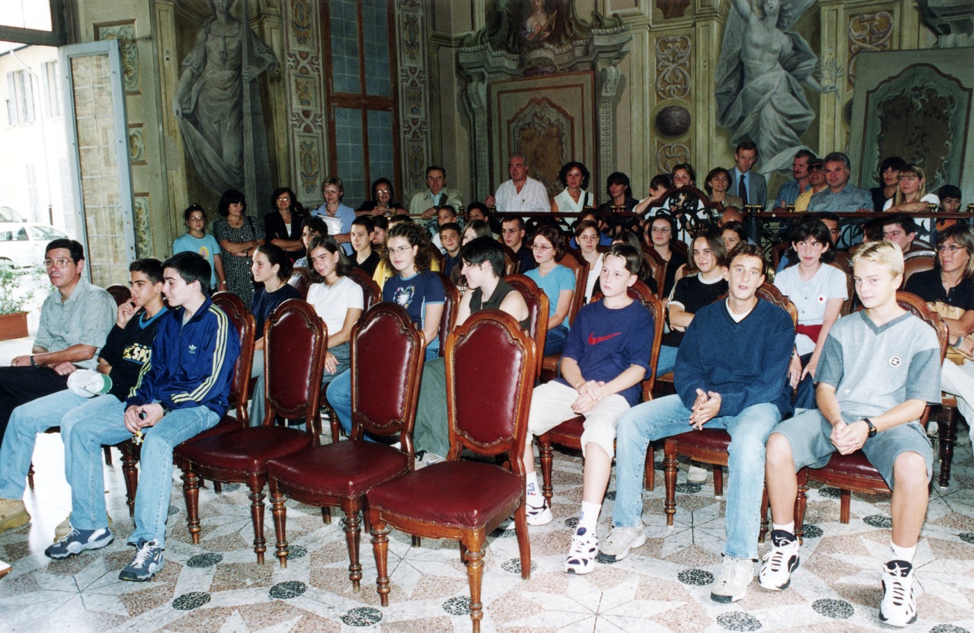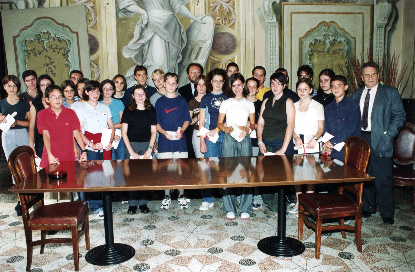 Foto di gruppo in occasione della consegna delle borse di studio, svoltasi presso la Sala Cleopatra di Palazzo Trotti il 15