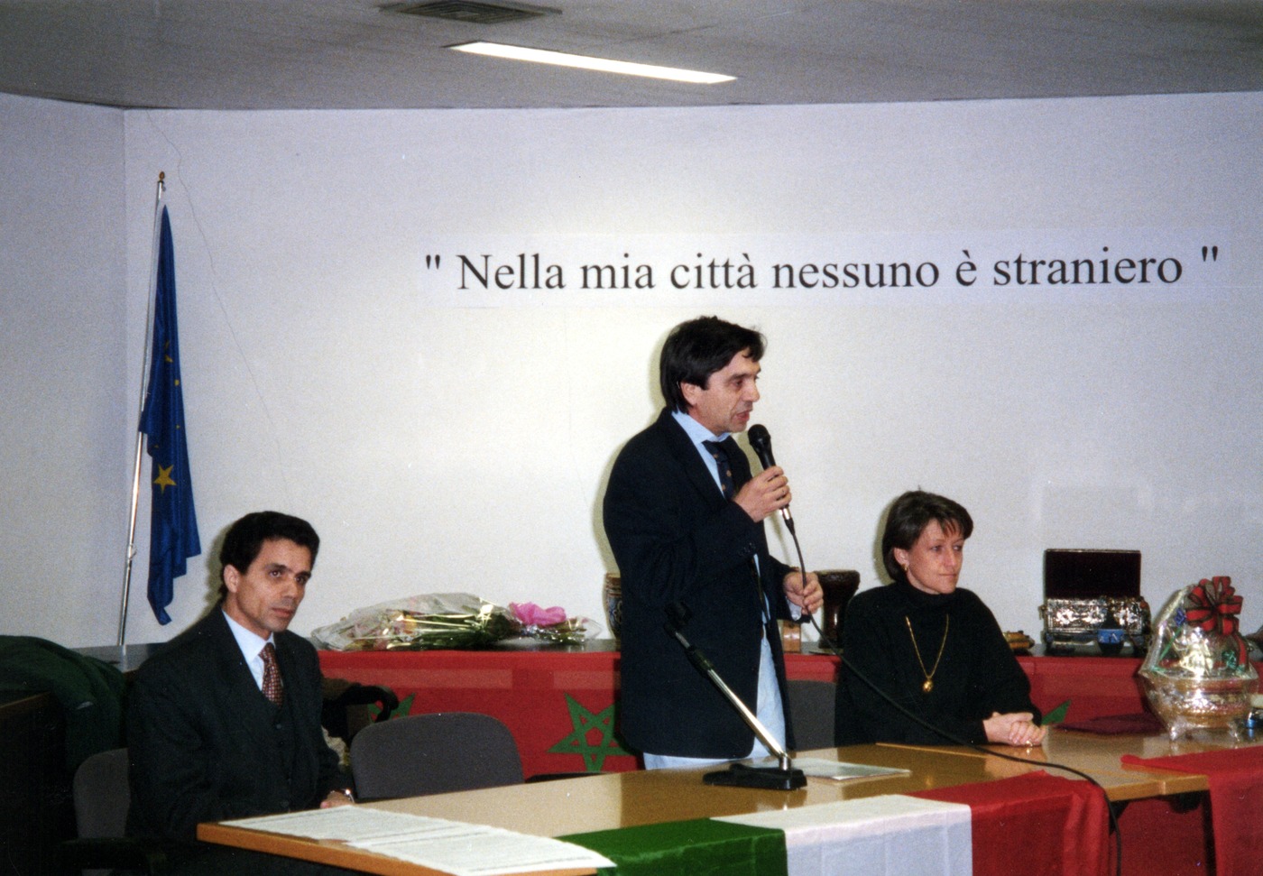 L'intervento di un relatore nel corso dell'incontro "Nella mia citta` nessuno e` straniero" organizzato dal Centro di orientamento