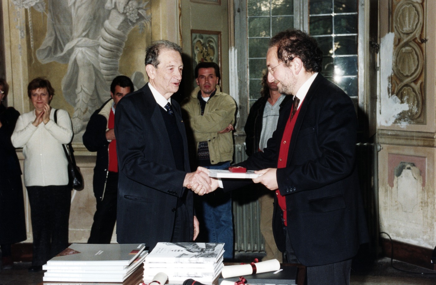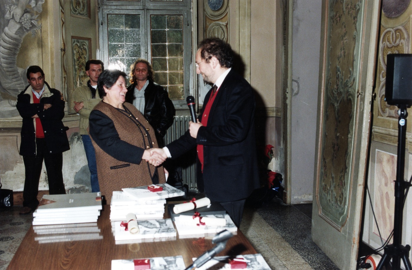 vimercatesi benemeriti, svoltasi nella Sala Cleopatra di Palazzo Trotti il 23 dicembre 1999. In alto, la premiazione di