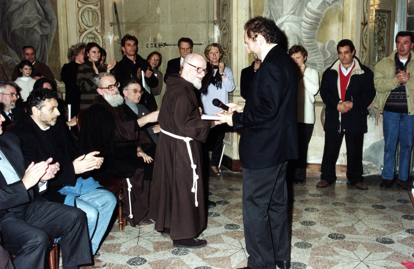 Il sindaco Enrico Brambilla consegna un riconoscimento a Padre Tito del convento dei Cappuccini di Oreno, in occasione