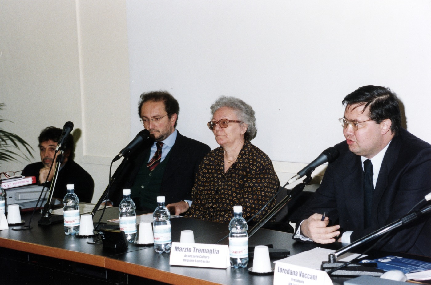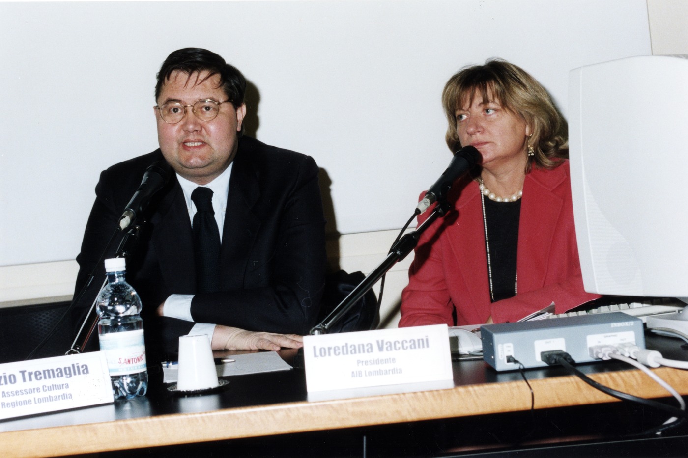 Regione Lombardia) e Loredana Vaccani (presidente della Associazione italiana biblioteche); al centro, da sinistra,