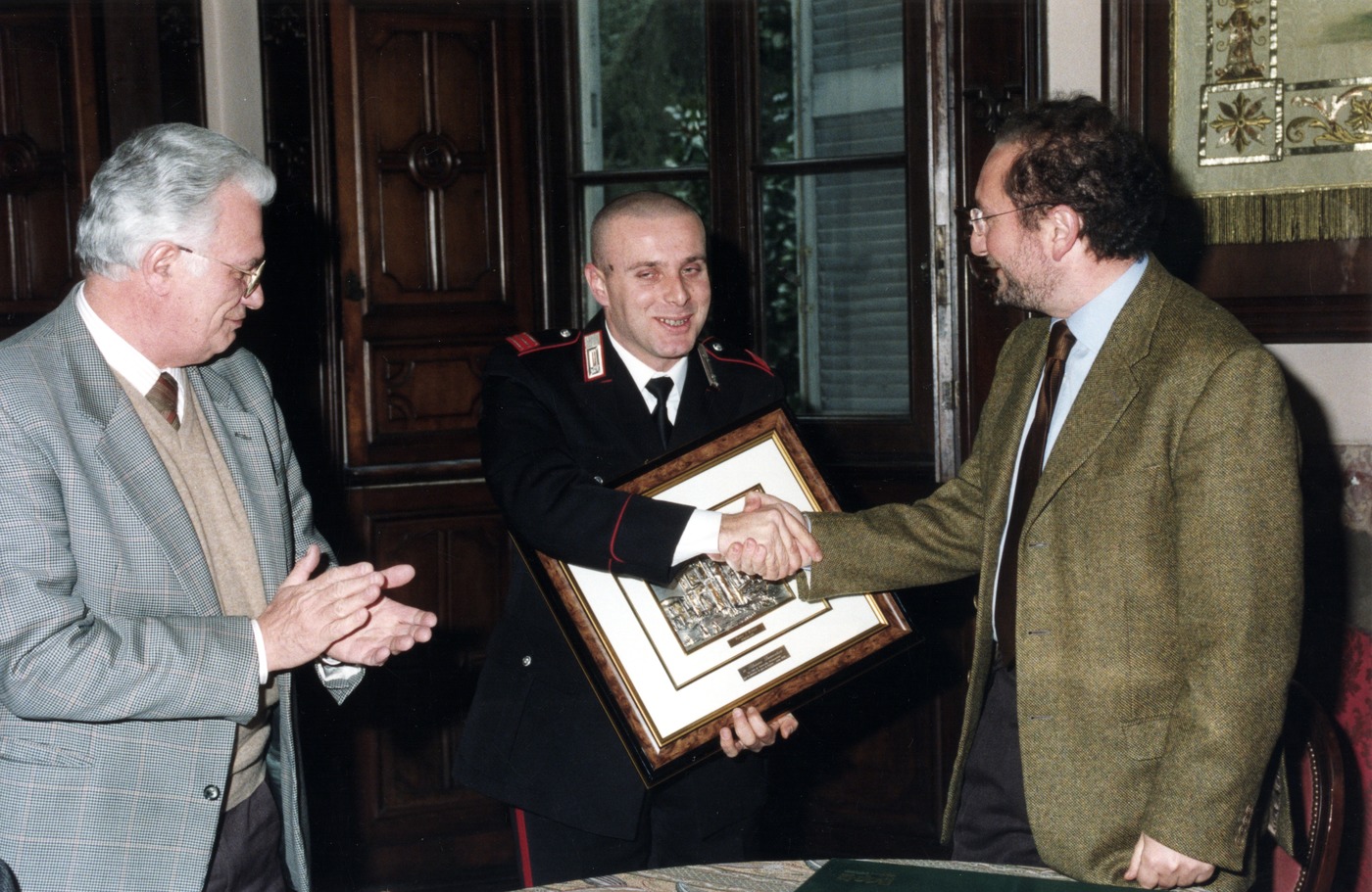 Il sindaco Enrico Brambilla conferisce un riconoscimento al Maresciallo Silvano Domestici, per la partecipazione alla missione