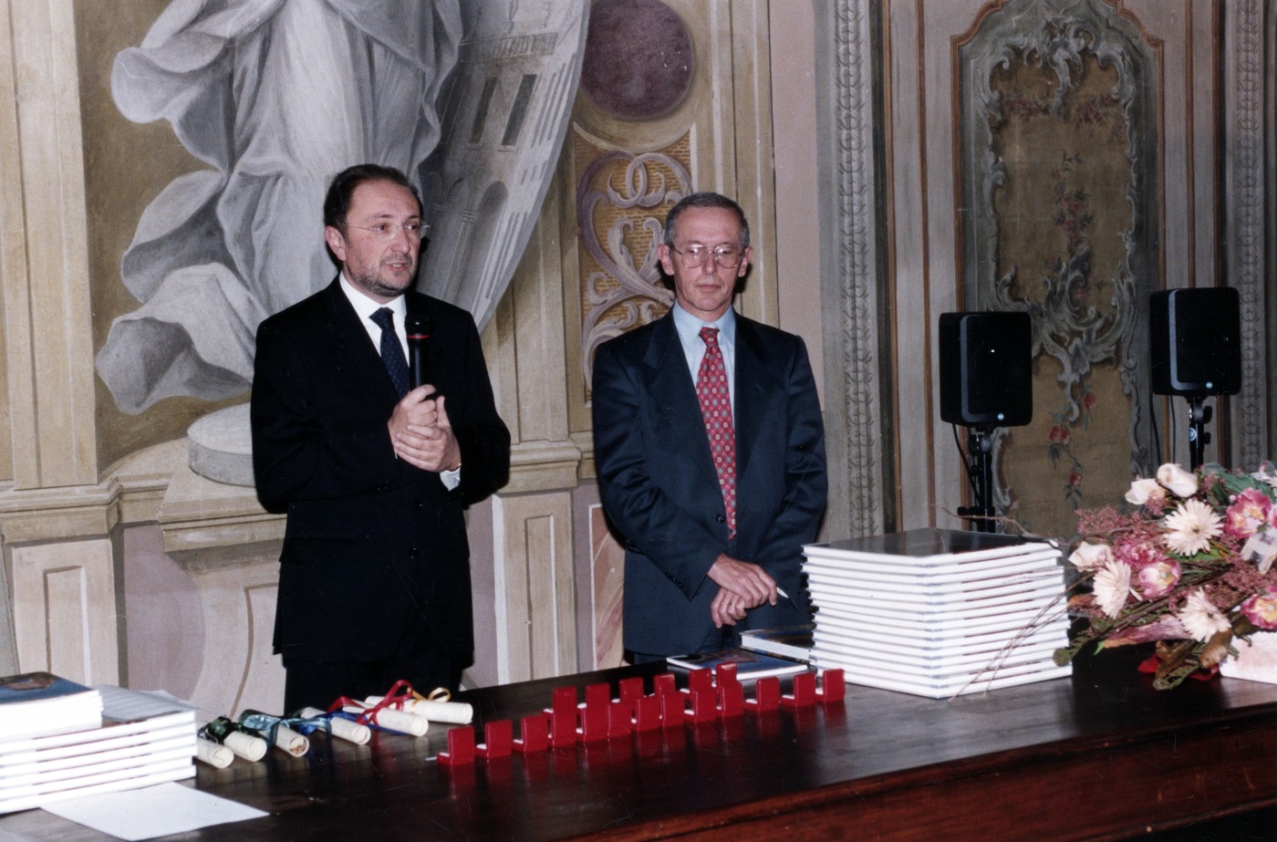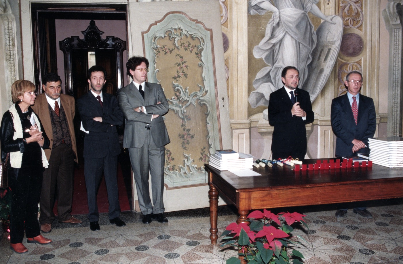 svoltasi nella Sala Cleopatra di Palazzo Trotti il 21 dicembre 2001. Da destra, l'assessore Vittorio Arrigoni, il sindaco Enrico