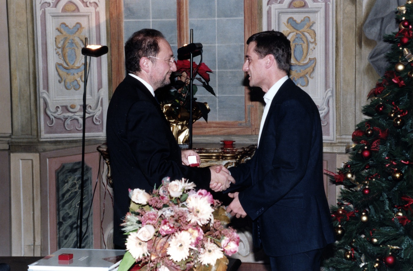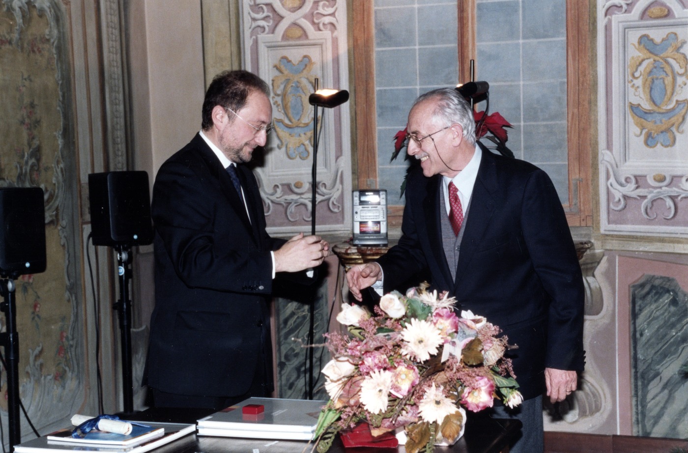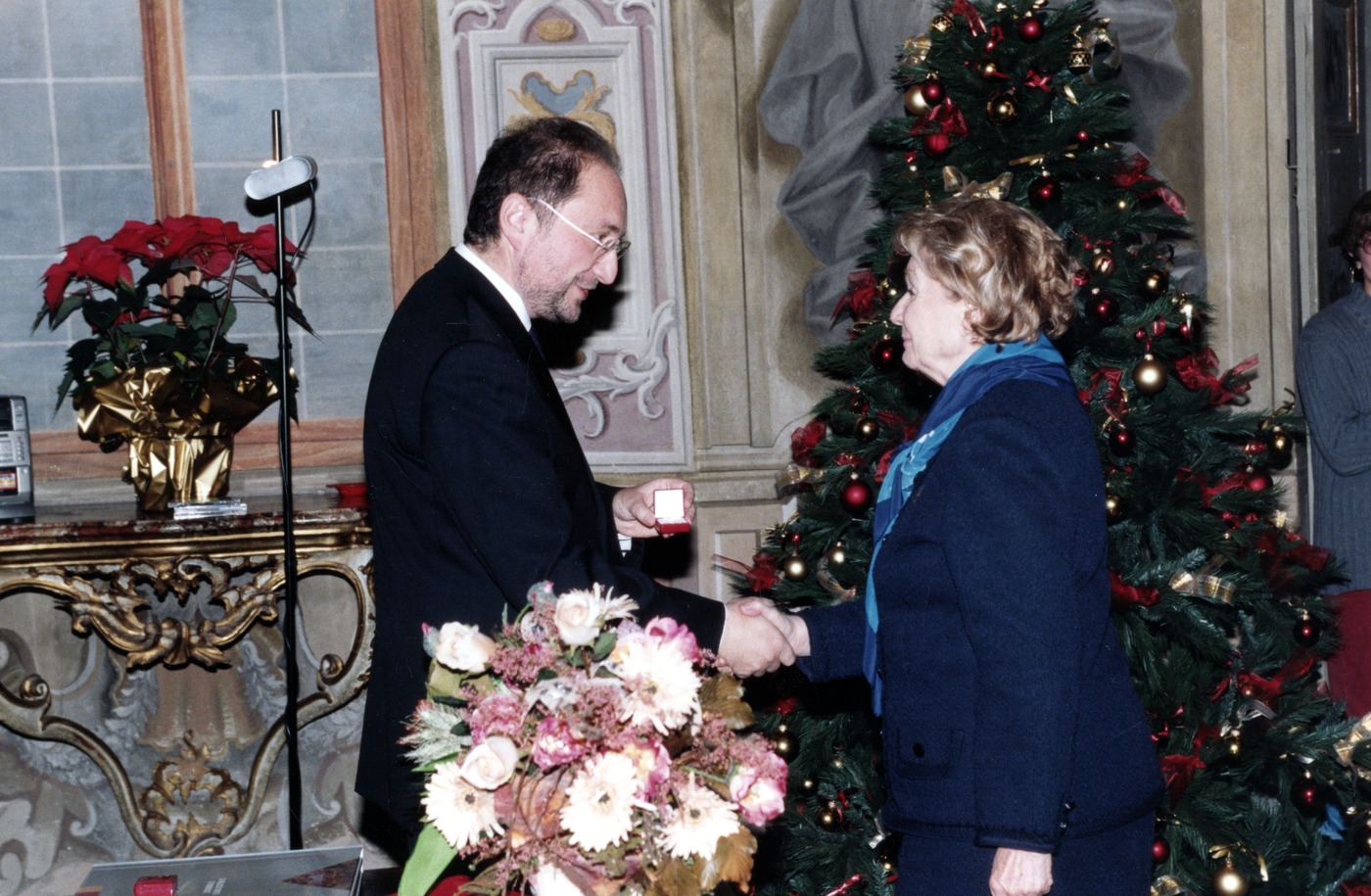 cittadini vimercatesi benemeriti, svoltasi nella Sala Cleopatra di Palazzo Trotti il 21 dicembre 2001. Dall'alto la premiazione di: