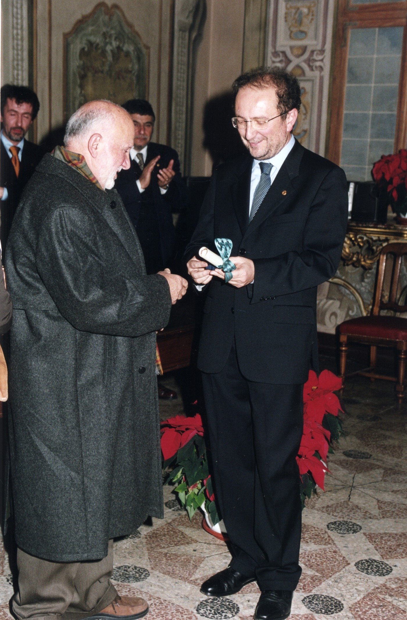 nel dicembre 2002. In alto, il sindaco Enrico Brambilla consegna un riconoscimento a Egidio Perversi; in basso, l'assessore