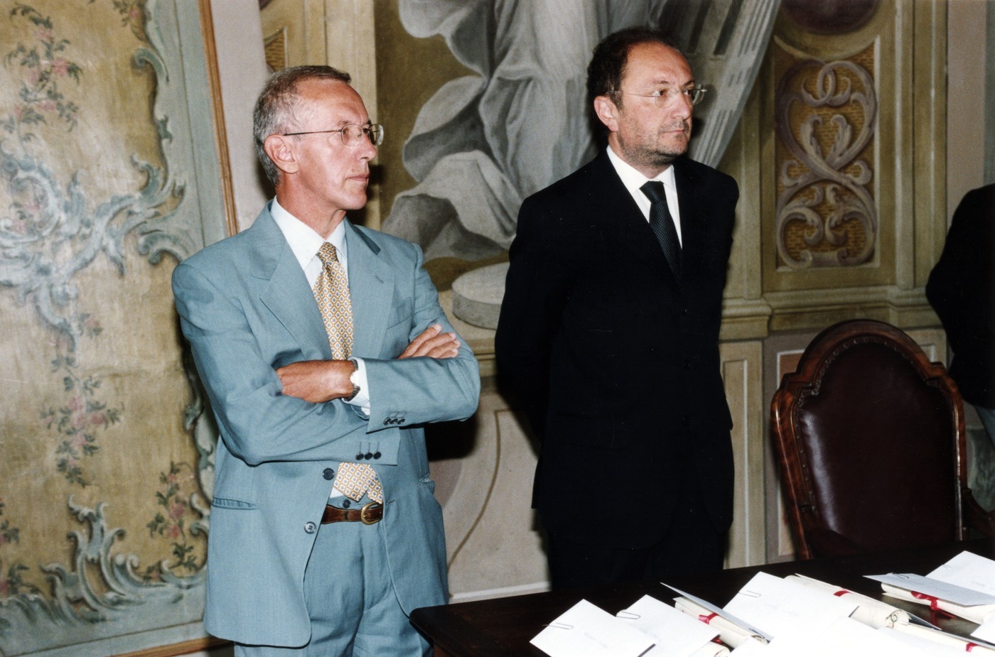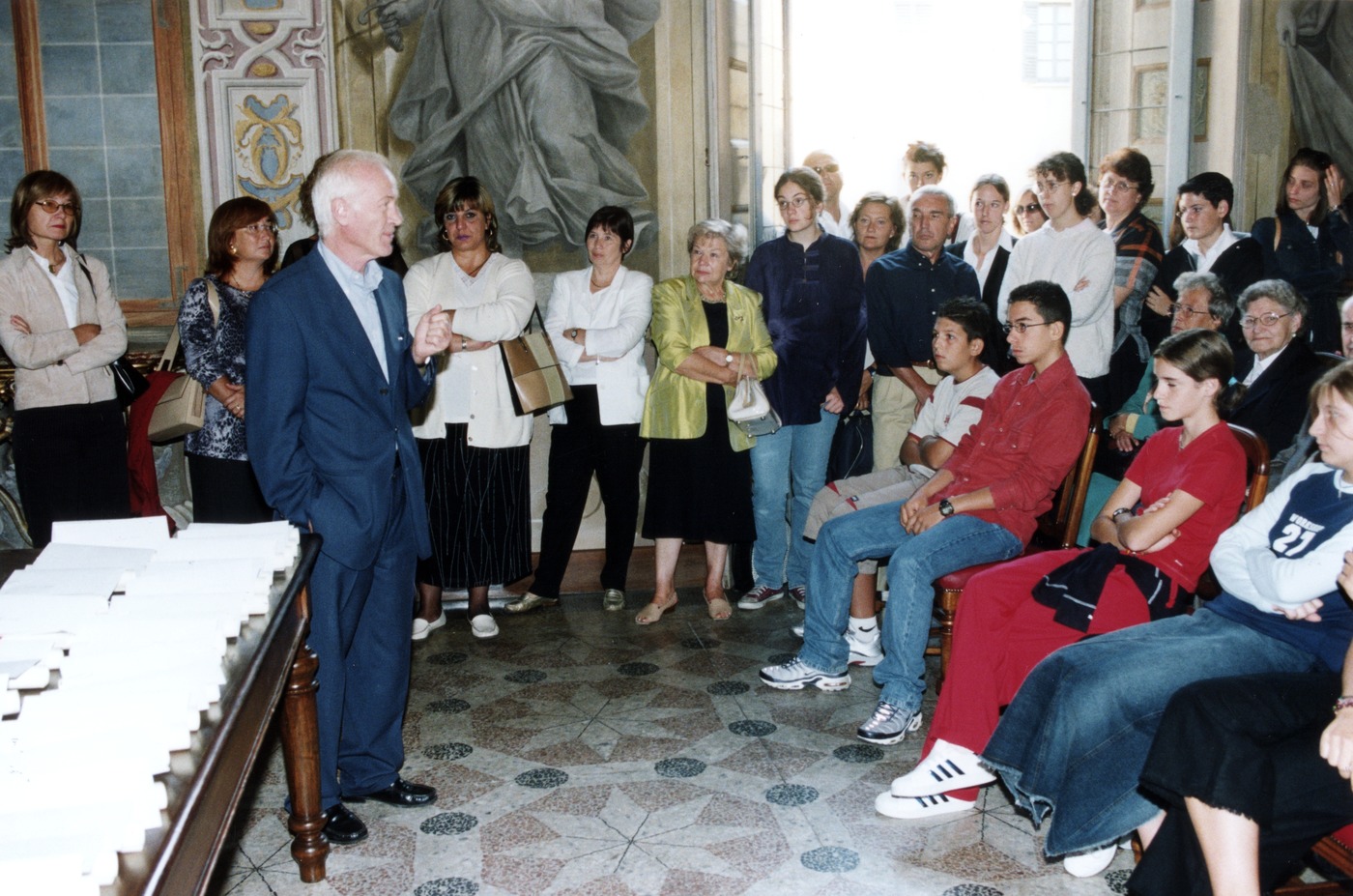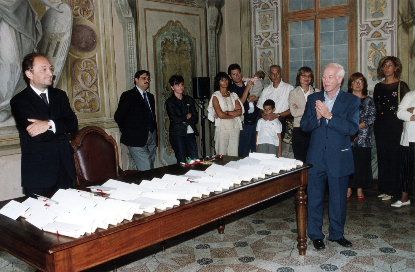 di Palazzo Trotti nel luglio 2002, alla presenza delle autorita` comunali. In alto e al centro, il discorso introduttivo di Luigi