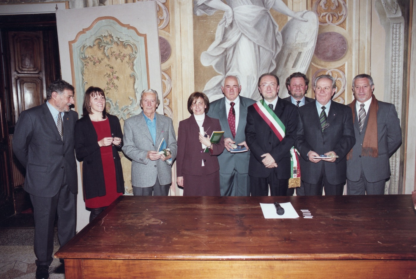 Il sindaco e gli assessori comunali ritratti con alcuni dei cittadini vimercatesi benemeriti premiati nel dicembre 2002 a Palazzo