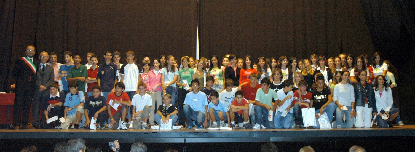 Foto di gruppo in occasione della consegna delle borse di studio e dei premi di studio agli studenti meritevoli delle scuole medie di Vimercate. A sinistra, il sindaco Enrico Brambilla.