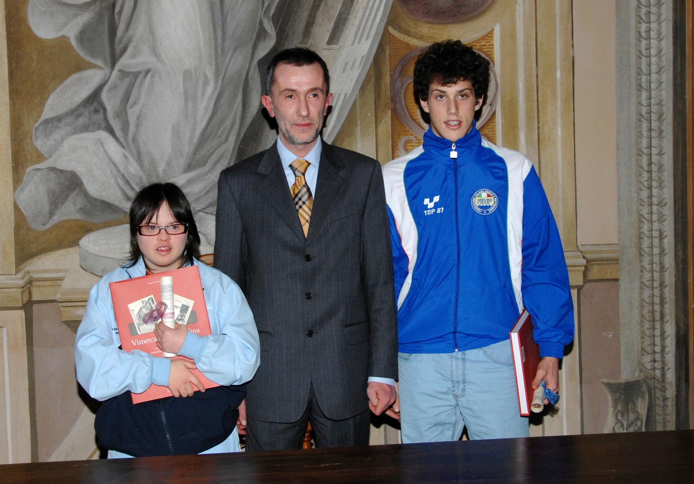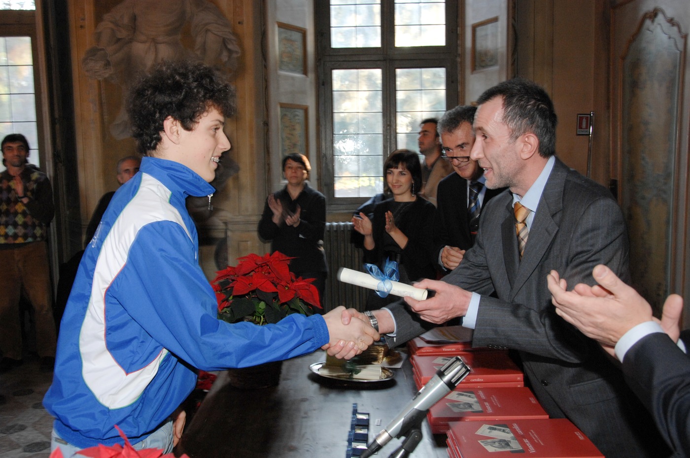 Il sindaco Paolo Brambilla consegna dei riconoscimenti a dei giovani sportivi in occasione della cerimonia di premiazione di