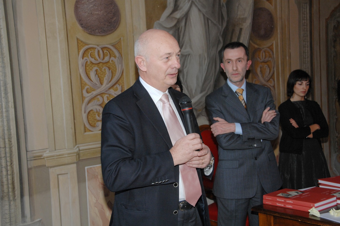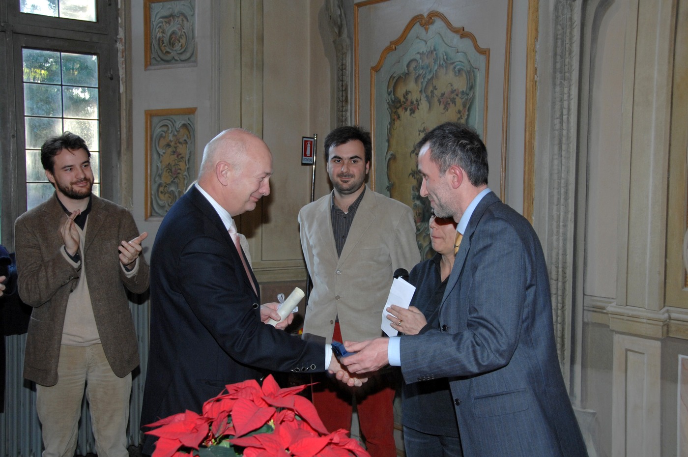 nel dicembre 2006. In alto, il sindaco Paolo Brambilla consegna un riconoscimento a Enrico Villa, sindaco di Vimercate dal