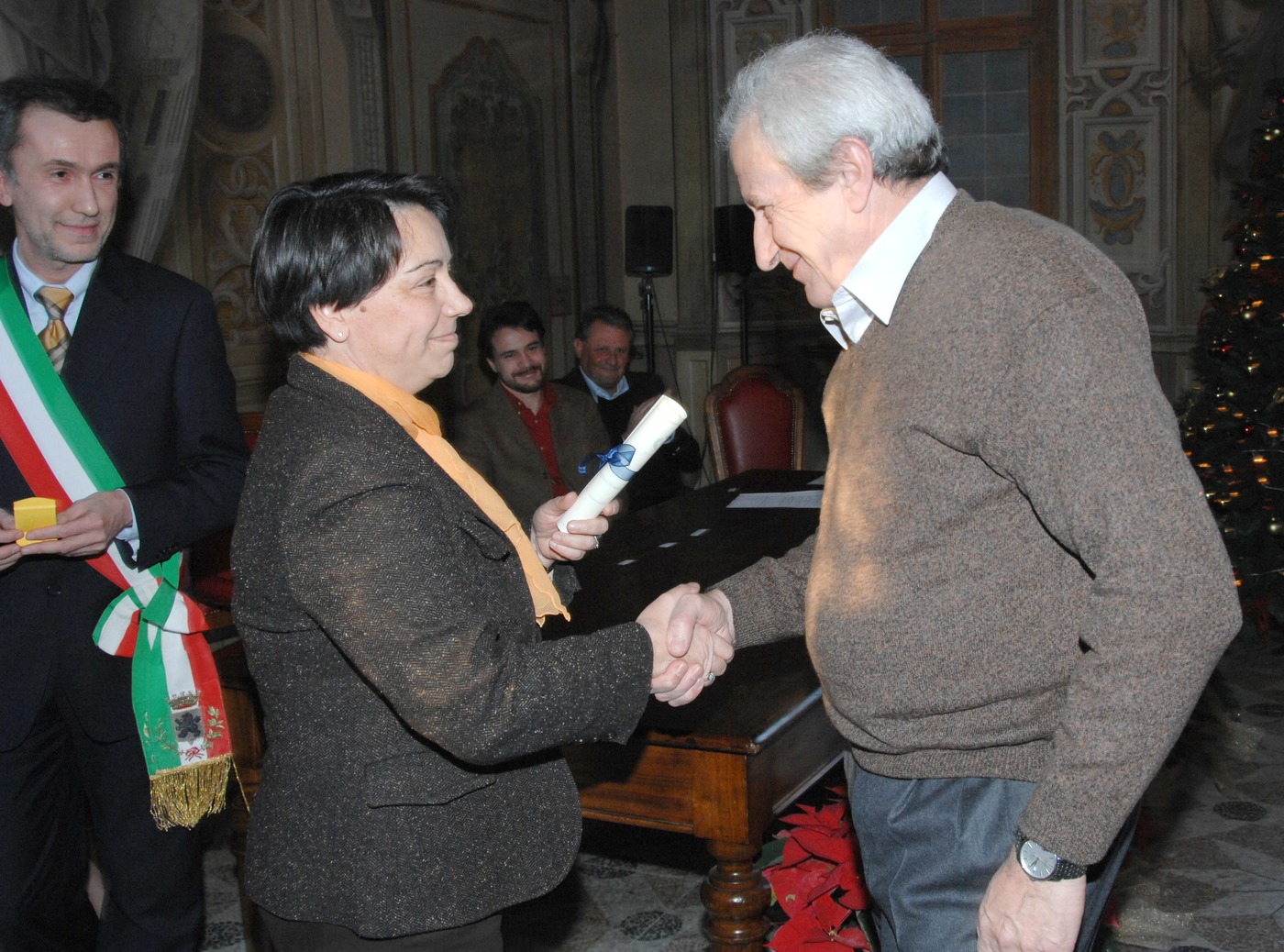 L'assessore Laura Curti consegna un riconoscimento a Cesare Passoni, protagonista del volontariato sociale cittadino,