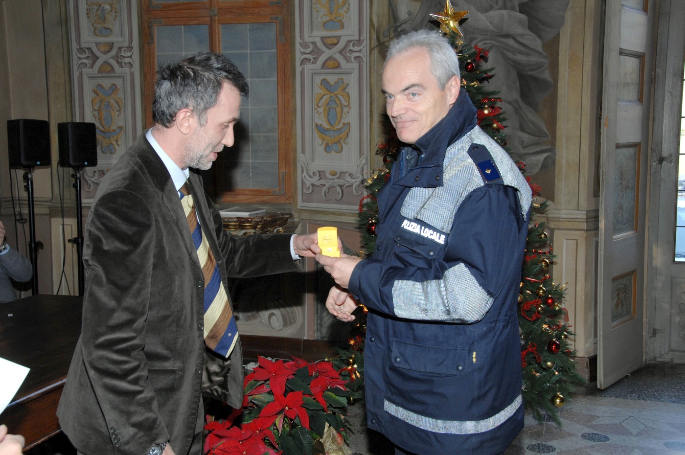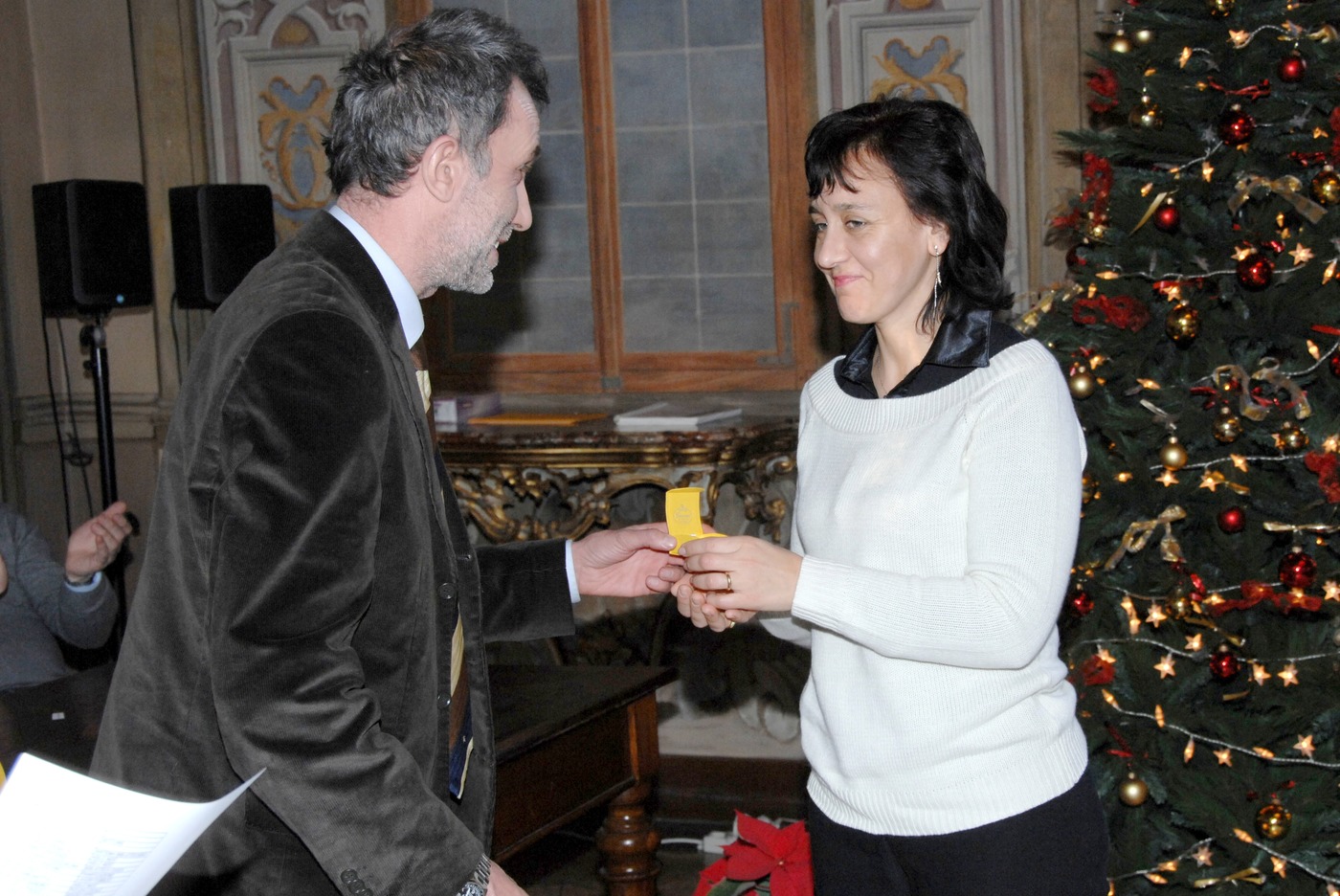Il sindaco Paolo Brambilla consegna un riconoscimento ai dipendenti comunali che festeggiano i 20 anni di servizio, in occasione del tradizionale scambio di auguri per le festivita` natalizie a Palazzo Trotti.