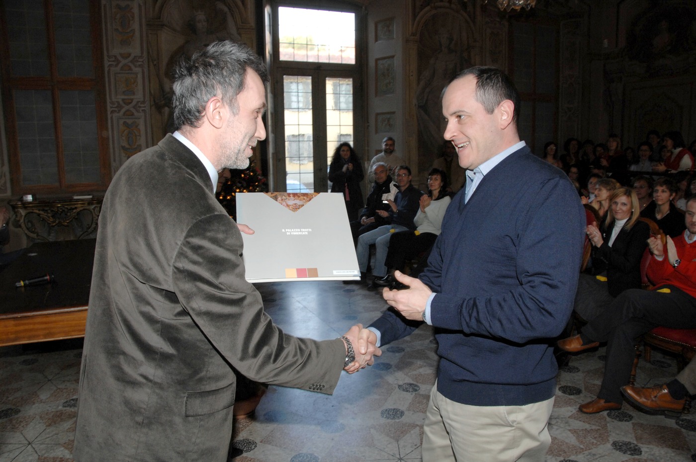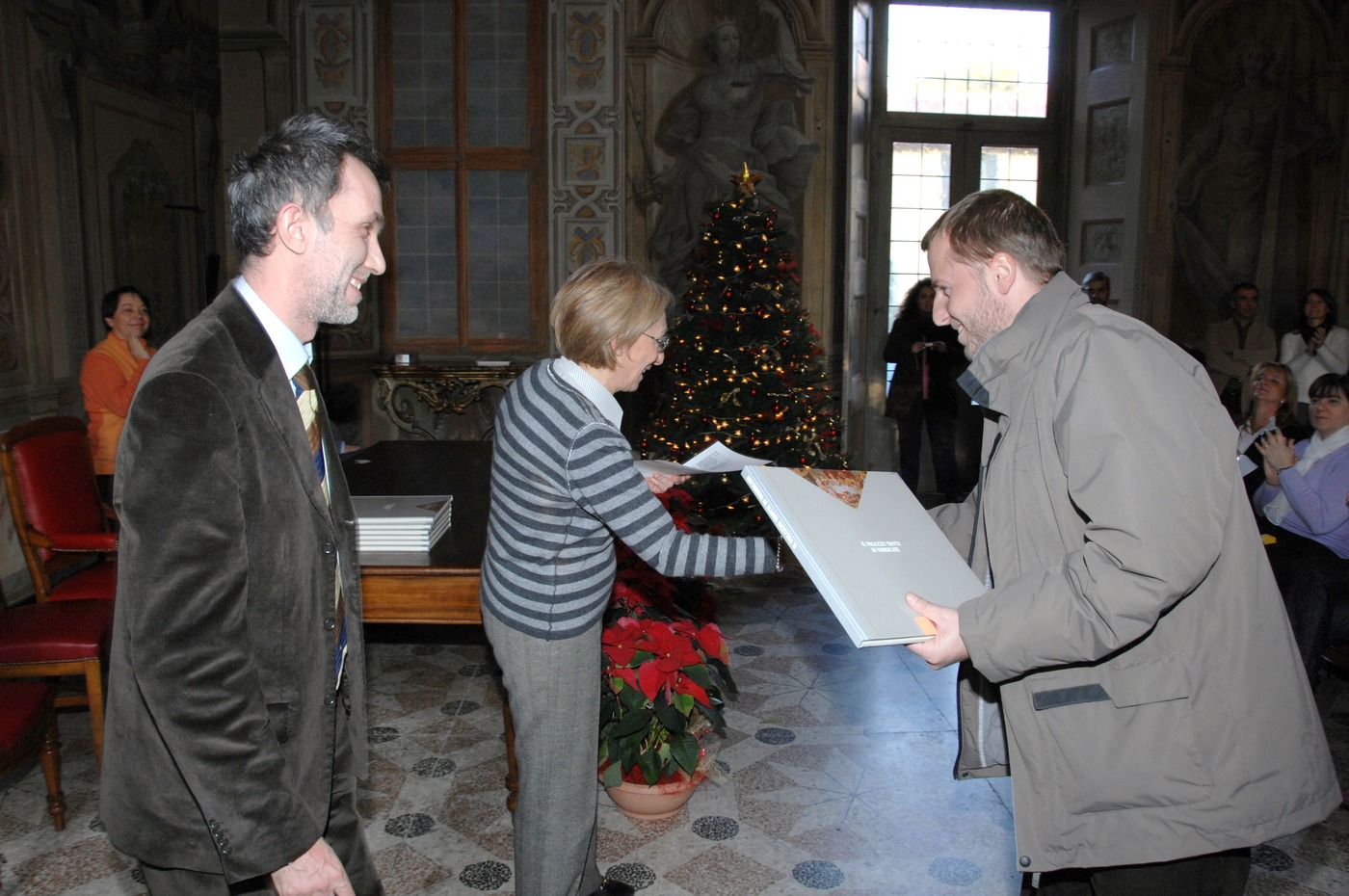Il sindaco Paolo Brambilla consegna un omaggio di benvenuto ai dipendenti comunali neoassunti, in occasione del tradizionale scambio di auguri per le festivita` natalizie a Palazzo Trotti.