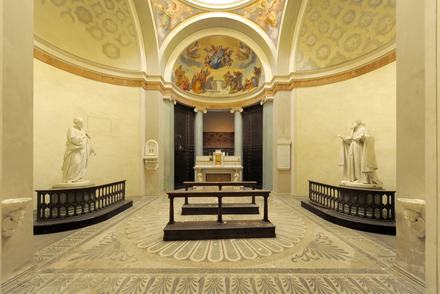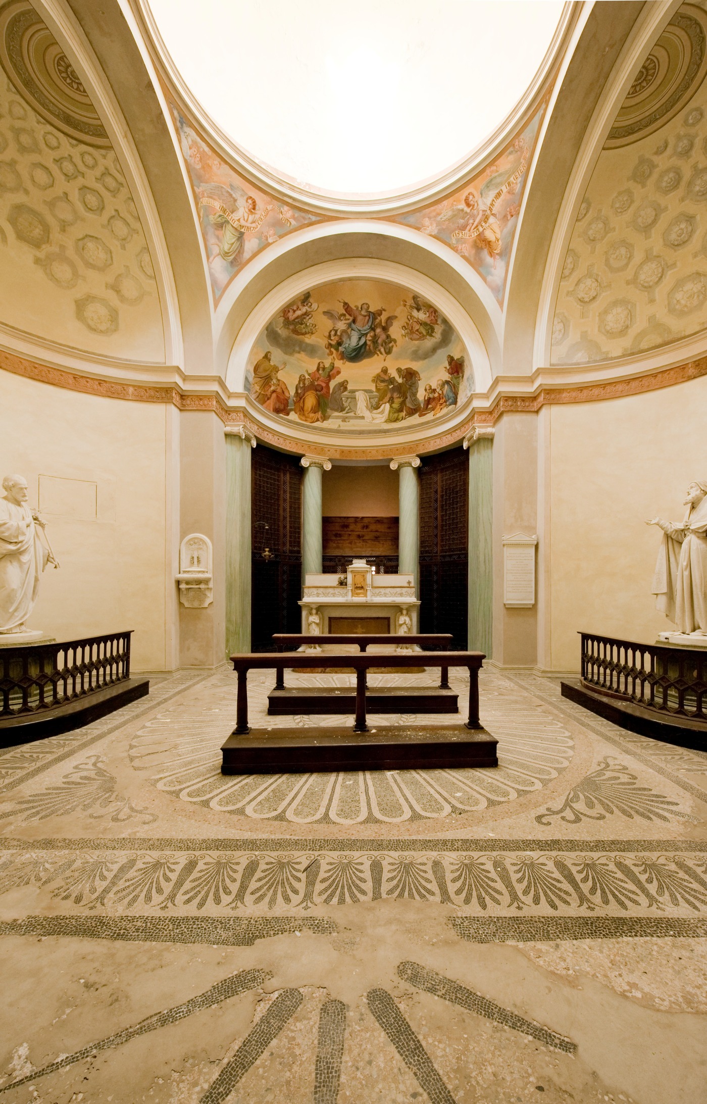 L'interno della cappella privata della Villa Gallarati Scotti di Oreno, dedicata a Maria Assunta; sulla destra, la statua di Papa