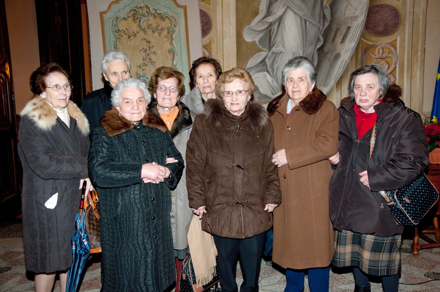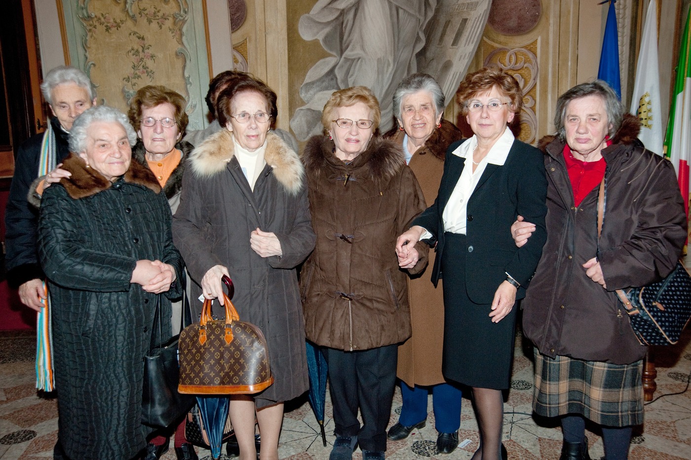 premiata nel dicembre 2010 a Palazzo Trotti. Intorno a loro, il gruppo del Movimento Terza Eta`.