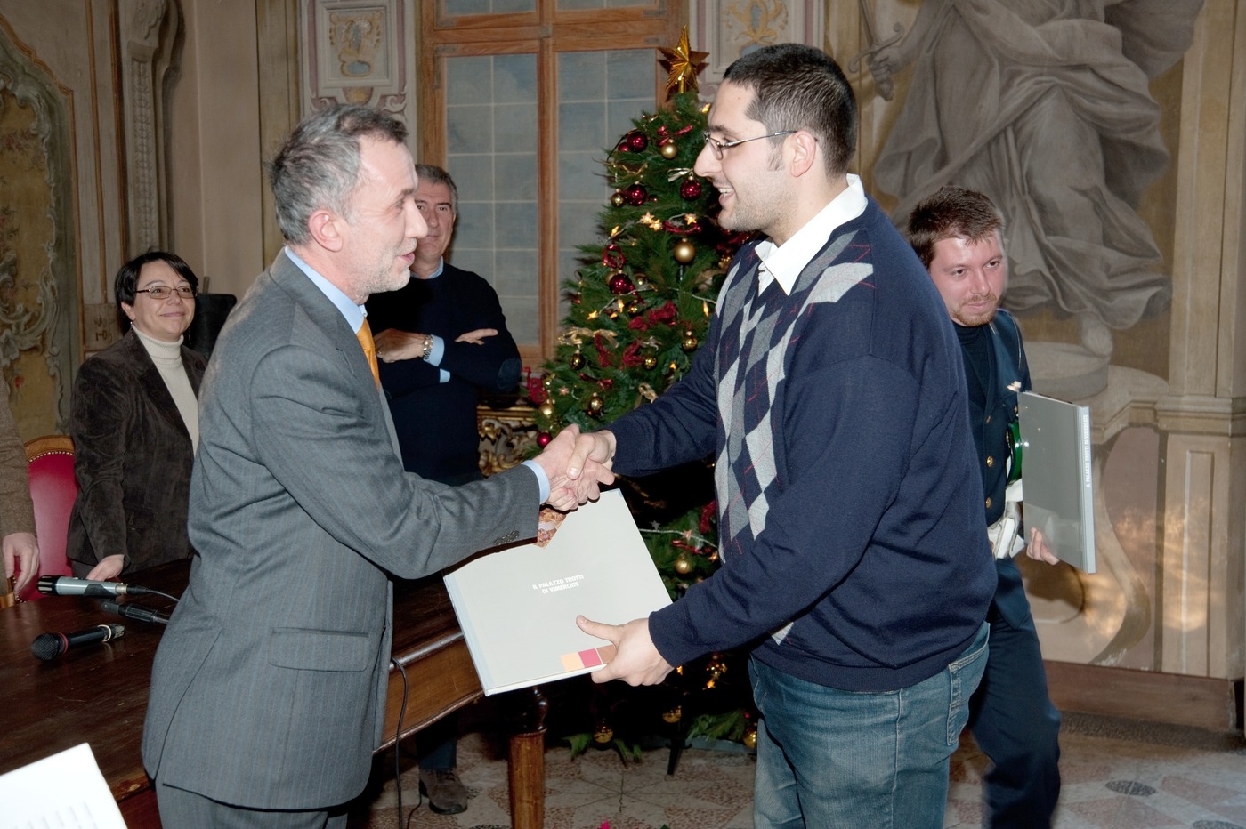 Il sindaco Paolo Brambilla consegna un omaggio di benvenuto ai dipendenti comunali neoassunti, in occasione del