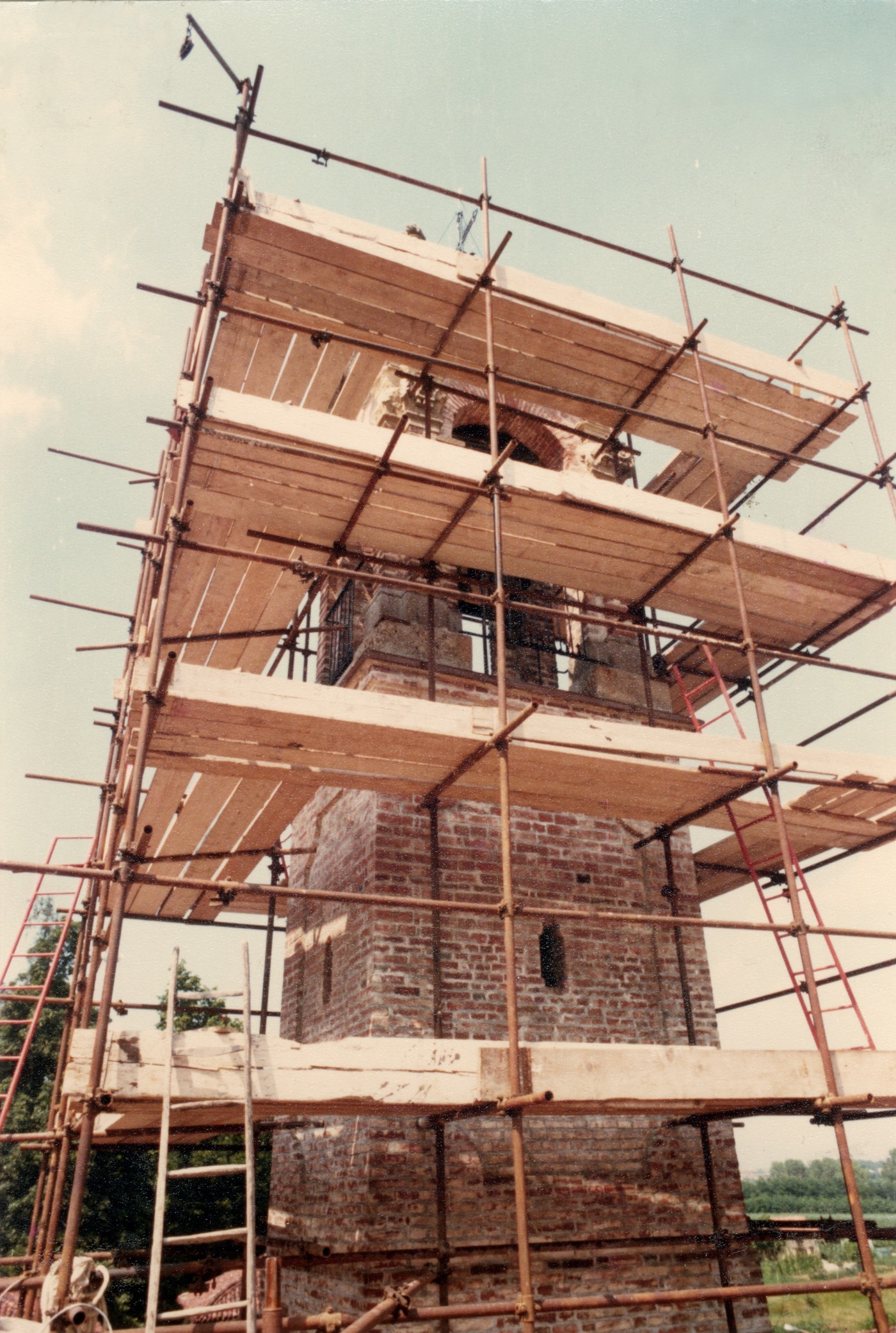 Il campanile della Chiesa di San Francesco di Oreno circondato dalle impalcature in occasione di un intervento di