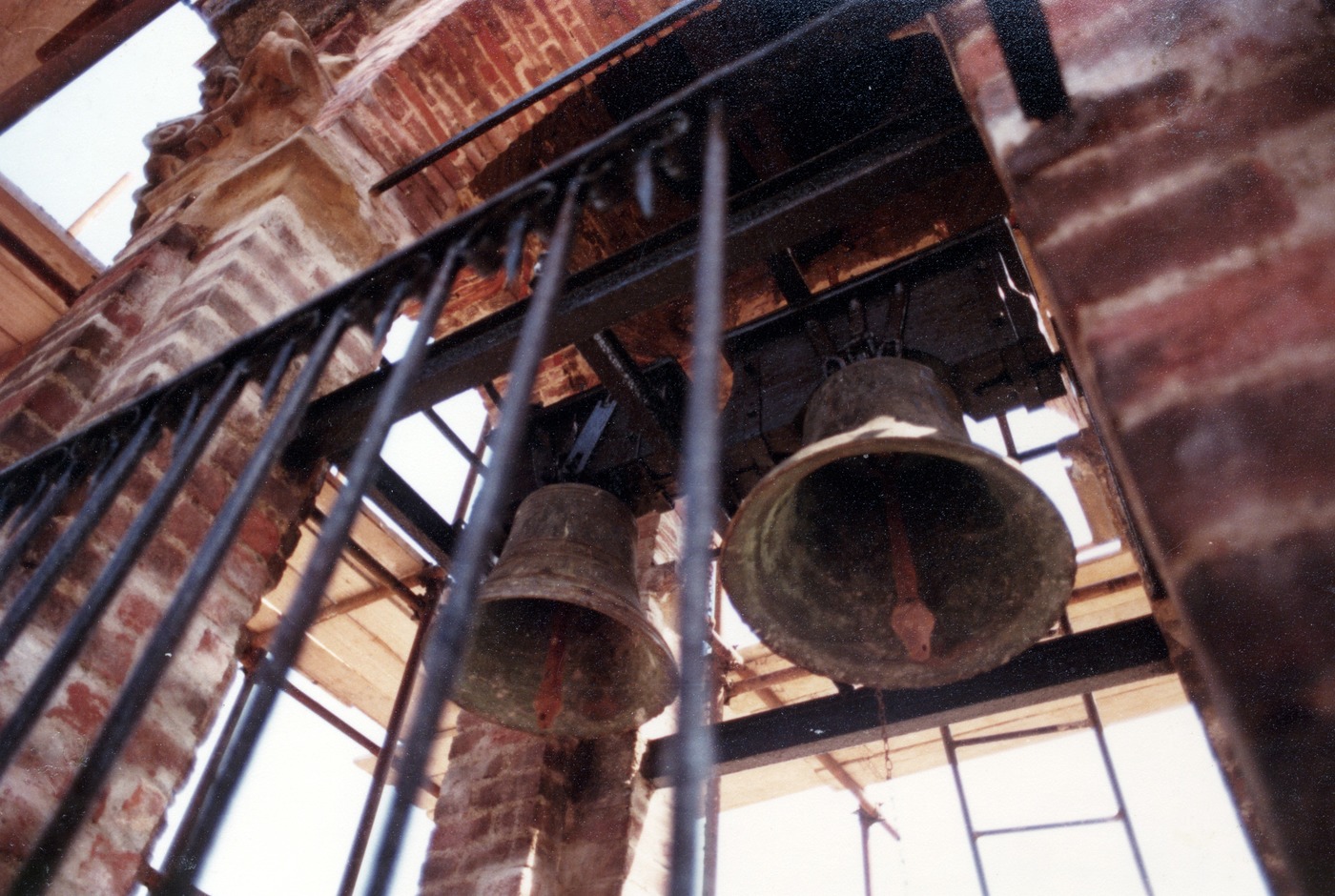 ristrutturazione; di seguito, alcuni particolari: la croce e i pinnacoli che ornano la cima e le campane.