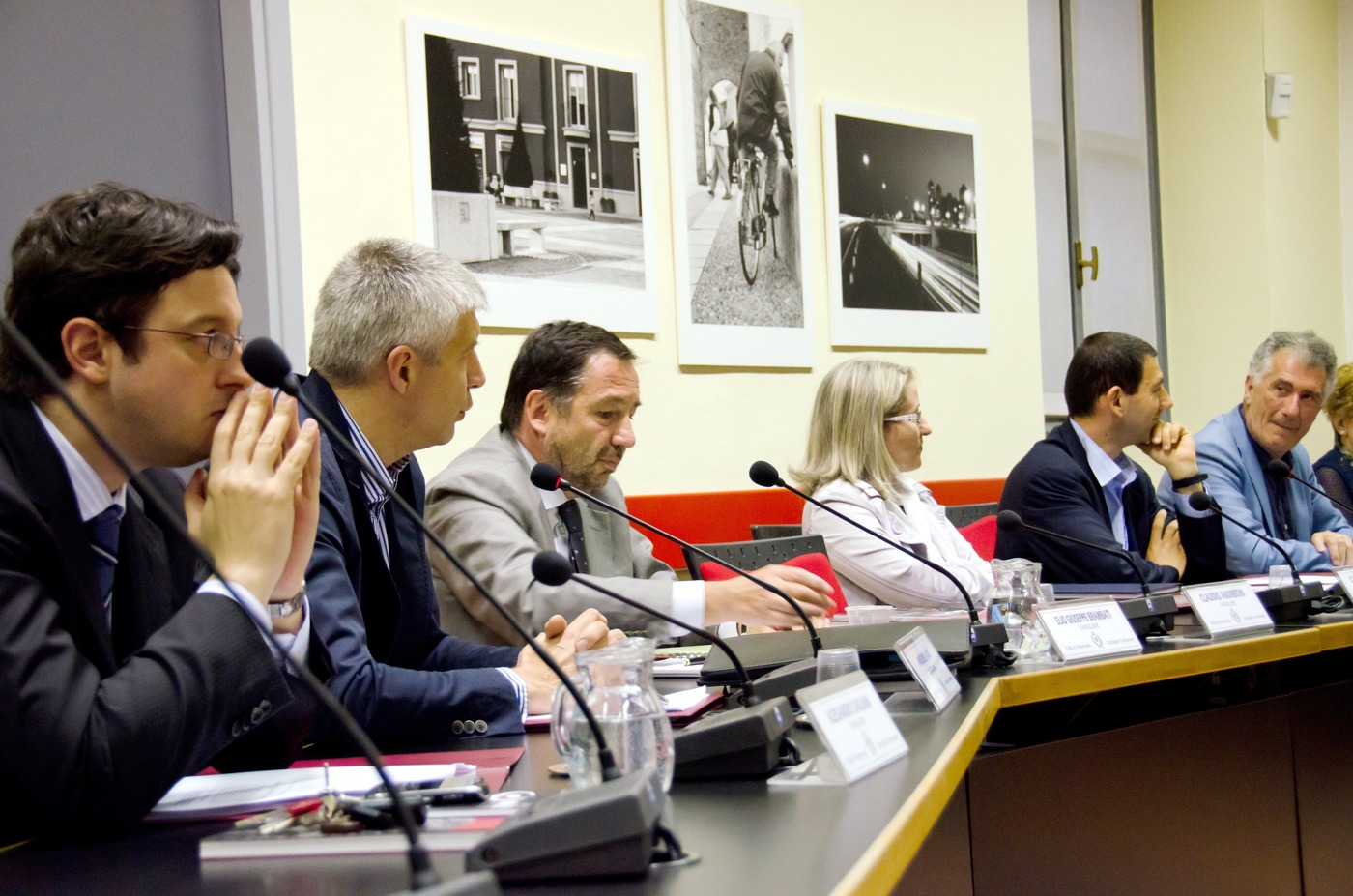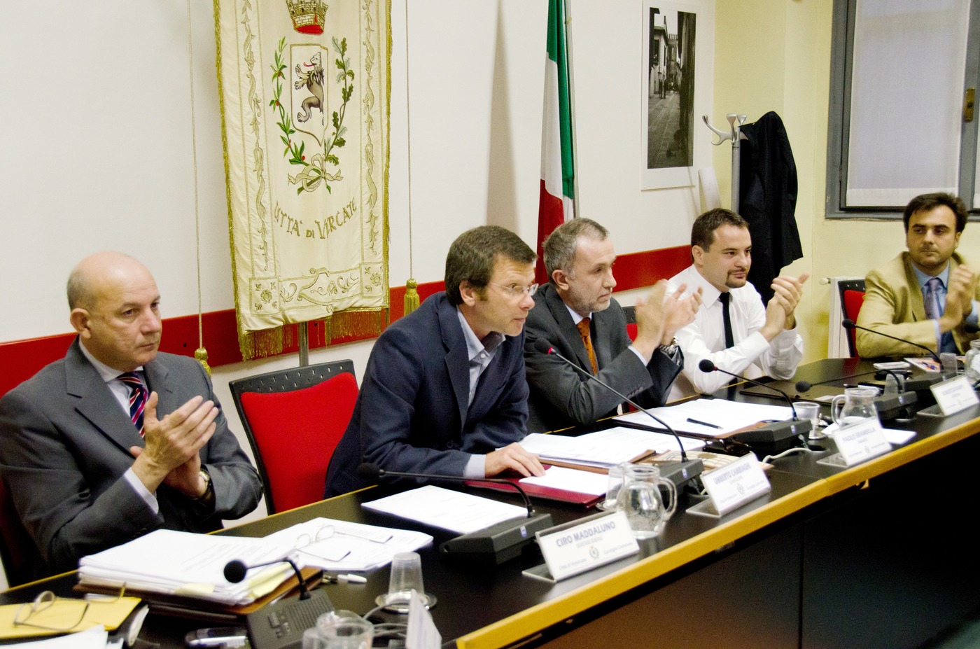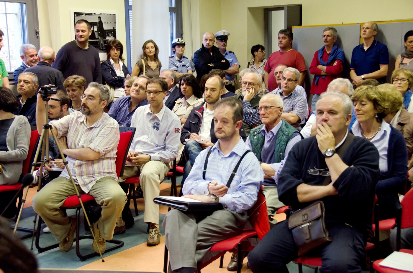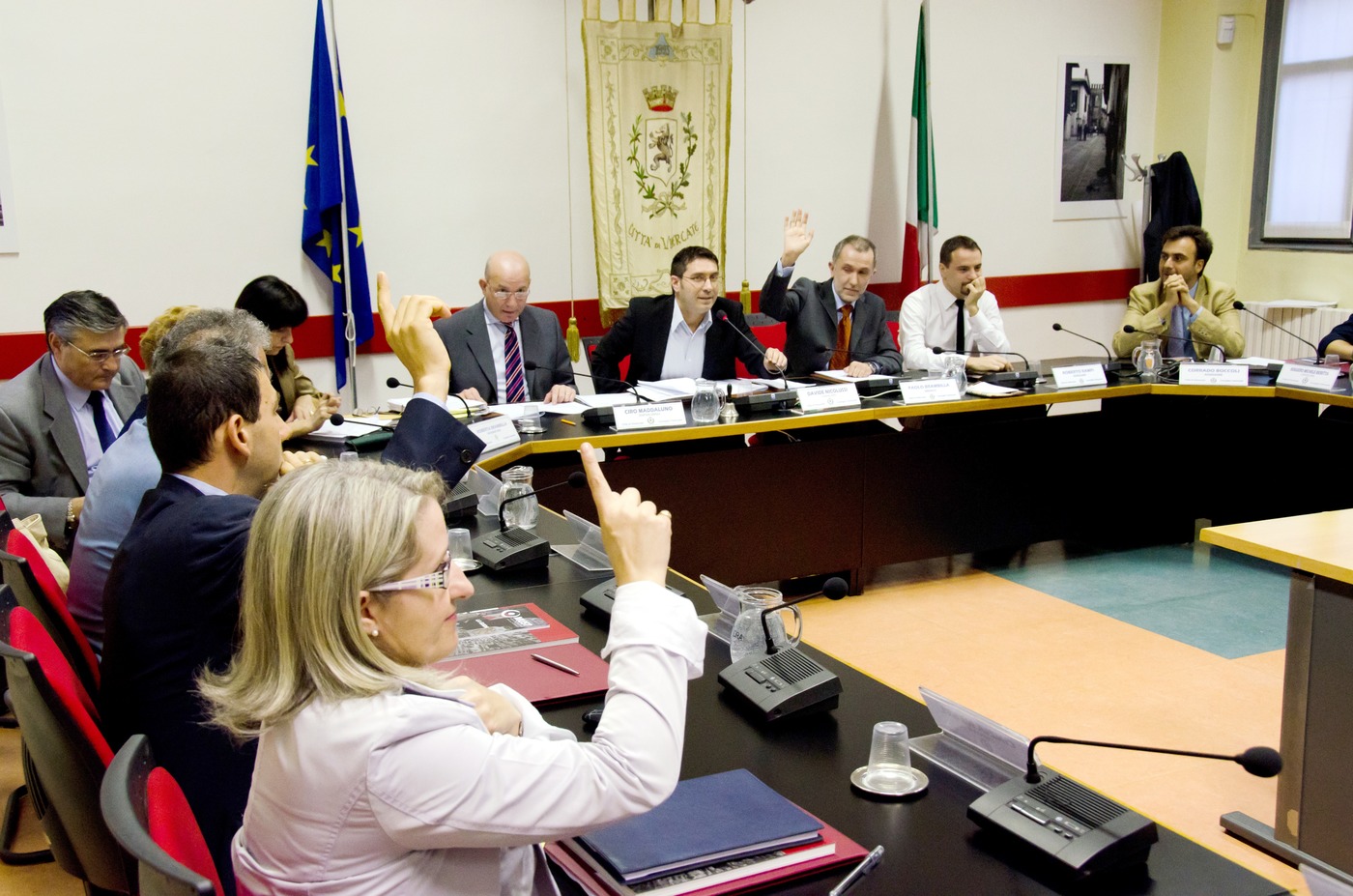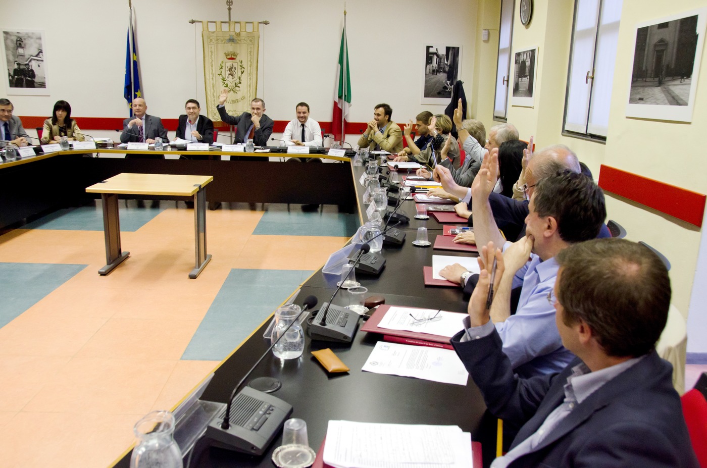 Alcuni momenti della seduta inaugurale del consiglio comunale eletto nel maggio 2011, svoltasi il 6 giugno 2011 presso la sala consigliare di Palazzo Trotti. In basso, il pubblico intervenuto.