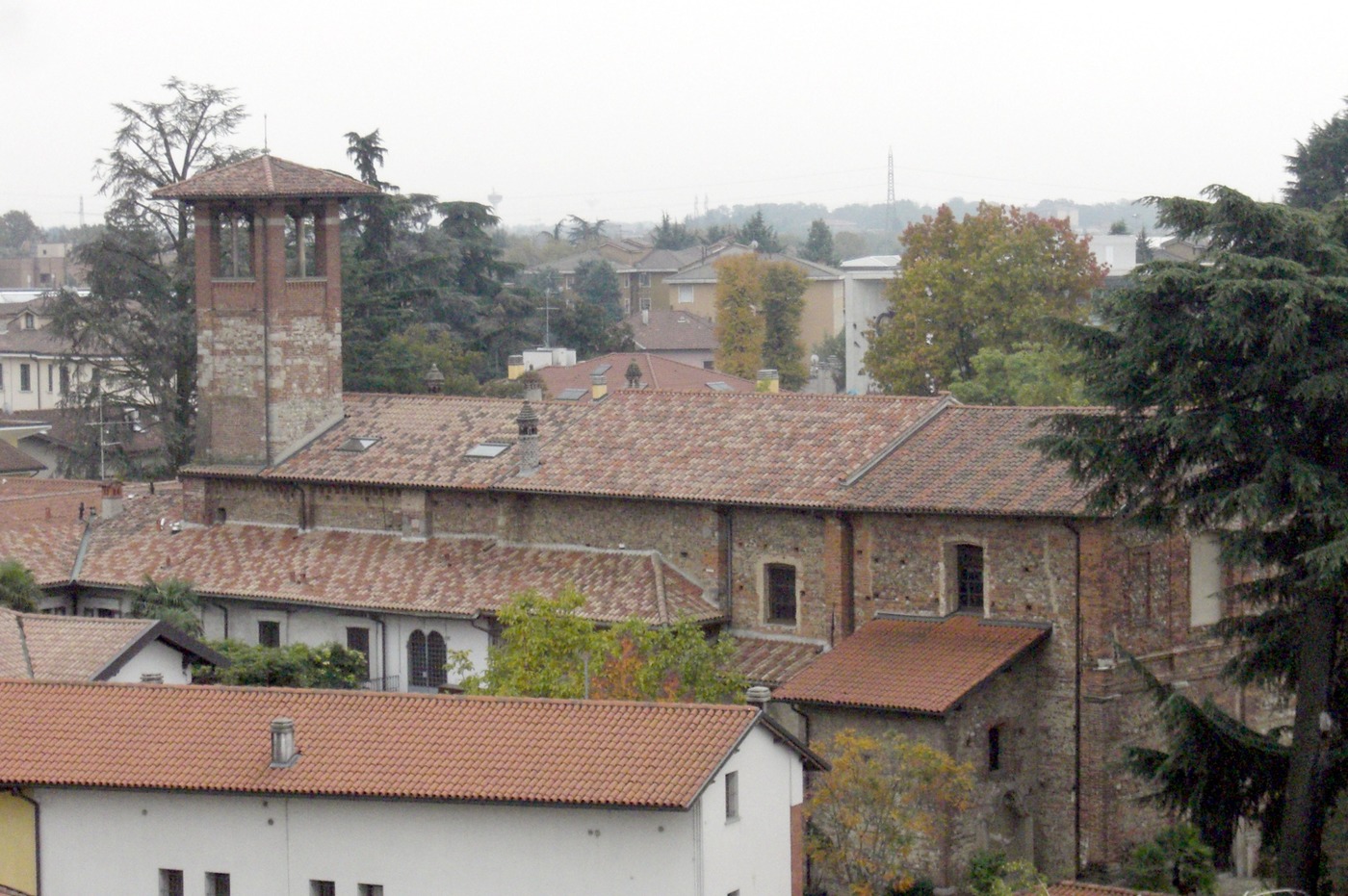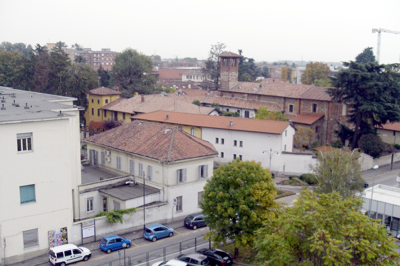 Vista dall'alto di via Ospedale all'incrocio con via Cereda. Sullo sfondo, l'ex Convento di San Francesco, soppresso nel 1798, ora Casa Banfi (in primo piano in basso).