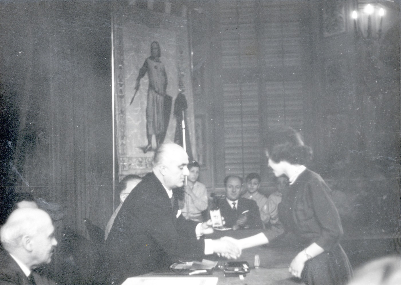 Il sindaco di Vimercate Attilio Cremagnani consegna un riconoscimento nel corso di una cerimonia a Palazzo Trotti.