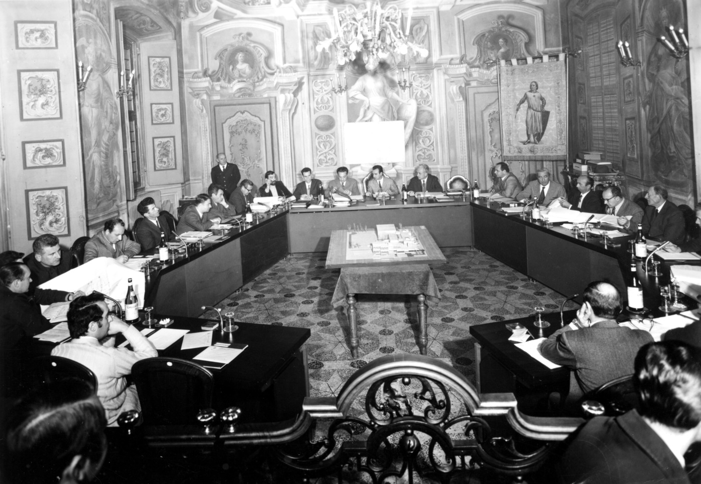 Sala Cleopatra di Palazzo Trotti: momenti della seduta del Consiglio comunale del 1* Dicembre 1969, mentre e` in