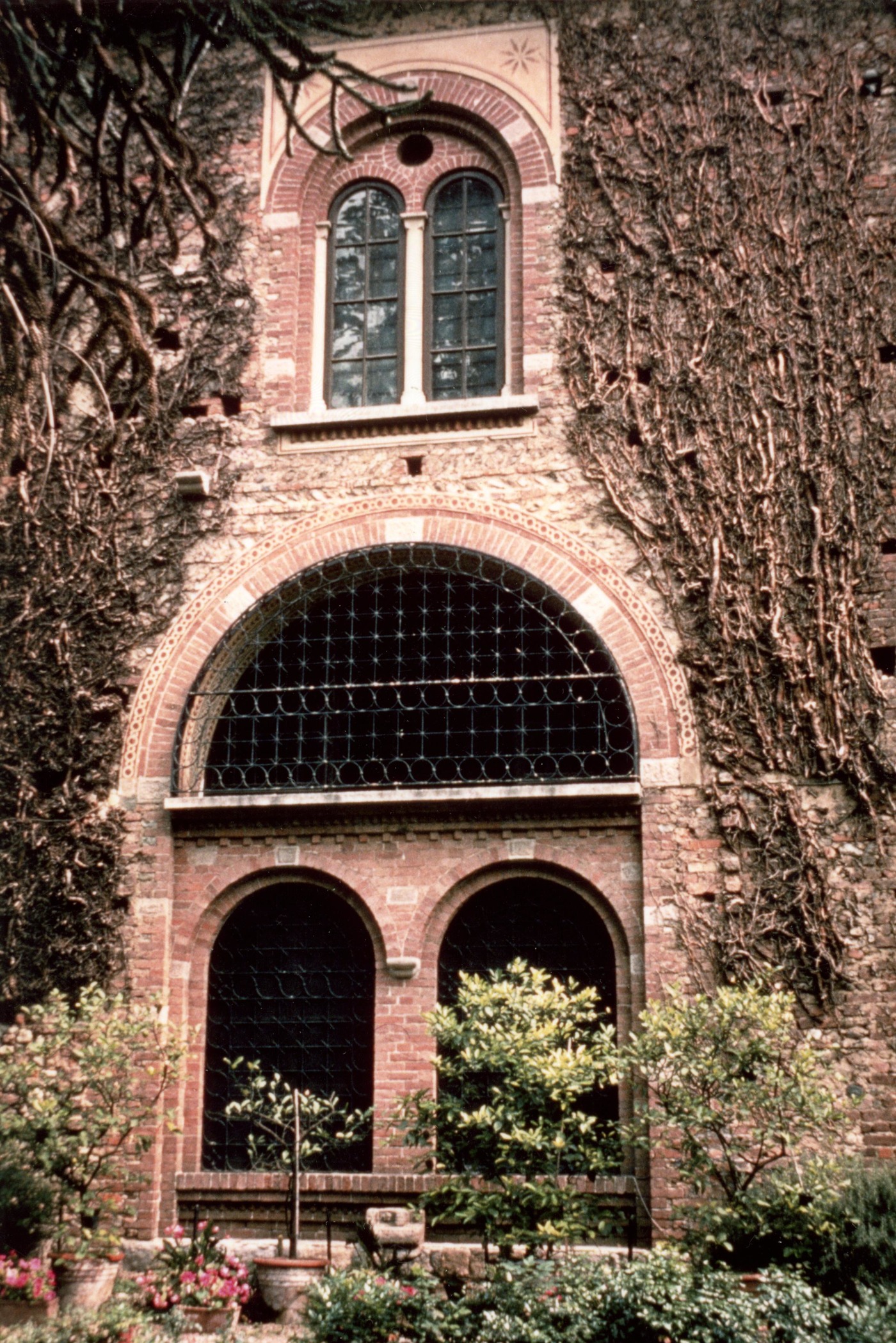 Particolari della facciata meridionale della chiesa e dell'ex Convento di San Francesco ora Casa Banfi, dopo i lavori di ristrutturazione avvenuti nel 1927.