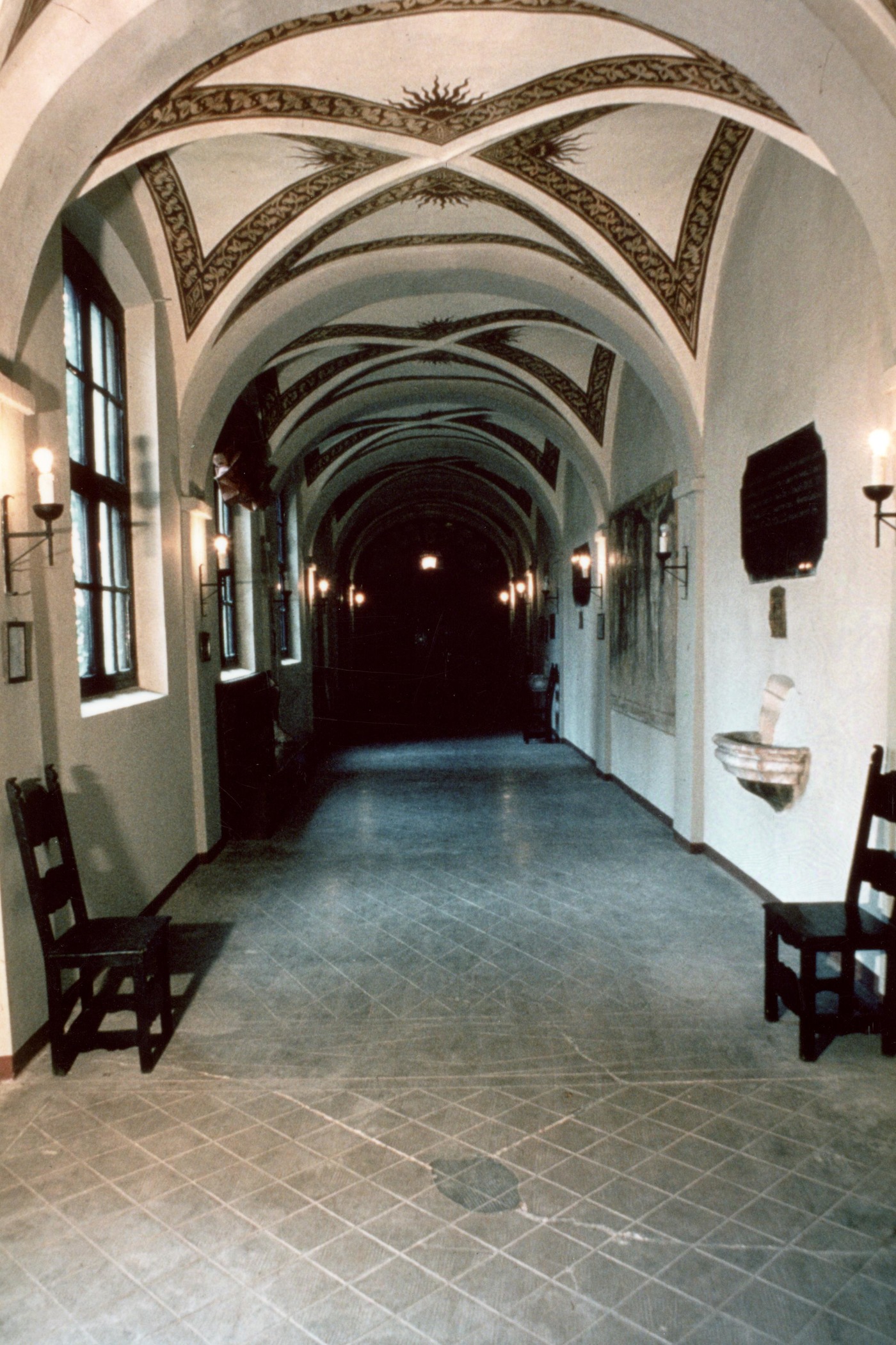 Il lato est del portico interno delimitante il cortile del chiostro dell'ex Convento di San Francesco, ora Casa Banfi.