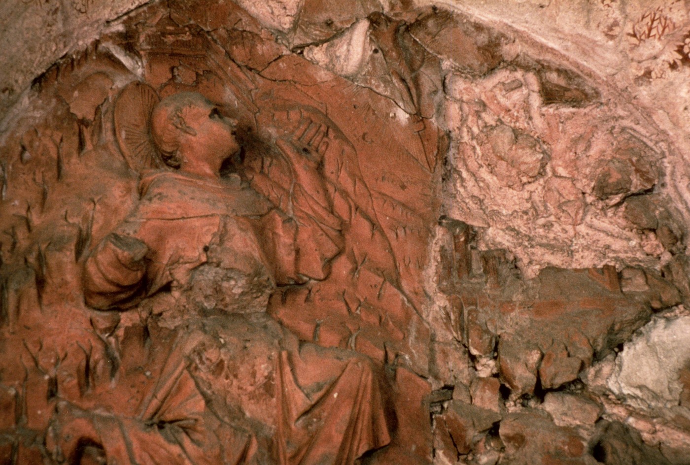 I resti di una lunetta in cotto, conservata nell'ex oratorio di San Giacomo dei pellegrini, attribuita alla scuola di G.A. Amadeo (1447-1522).